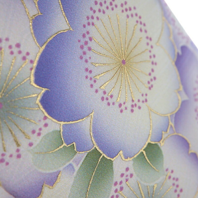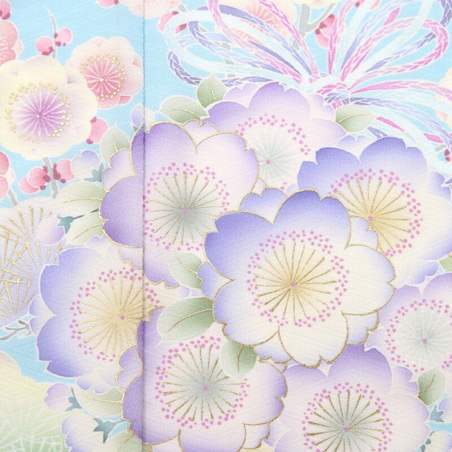 爽やかでフレッシュなカラーは、「水色(みずいろ)」と呼ばれ、澄んだ水の色を模した淡い青色のことです。そんな美しい着物地に、豪華な文様が描かれた非常に華やかな一着です。着物中央に大きく描かれる「薬玉」は源氏物語にも登場し、歴史が古く、元々は端午の節句に魔除けとして飾られたもの。薬草である菖蒲や蓮の花を編んで玉を作り、5色の糸を通して飾っていました。女の子のお祝い着では色彩豊かに花々が描かれ、5色の糸がリボン状にデザインされていて、まるで可愛いブーケのよう。不浄を払い邪気を避け、長寿を願う意味が込められた縁起のいい文様です。「桜」は、咲き誇る姿から繁栄や豊かさを表しており、また春に咲くことから新しい門出を意味します。「菊」は、太陽の形に似ていることから、最も位の高い花とされてきました。長寿や不老不死の意味も込められます。「梅」は、厳しい冬が終わるといち早く香り高い花を咲かすことから、逆境に負けない力強さ、忍耐力、生命力を表します。女の子らしい可愛さの中に、上品さ大人っぽさを感じるお祝い着です。