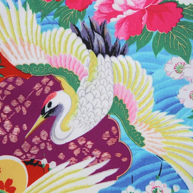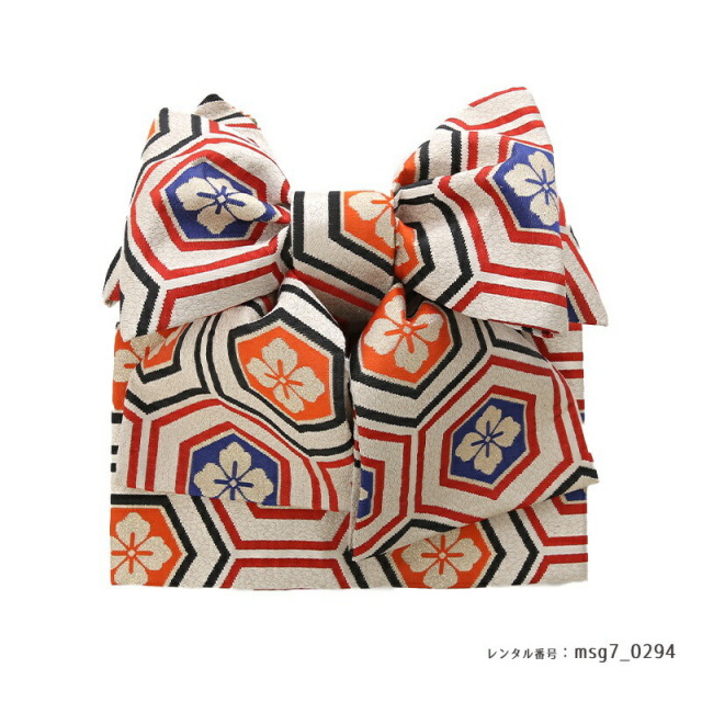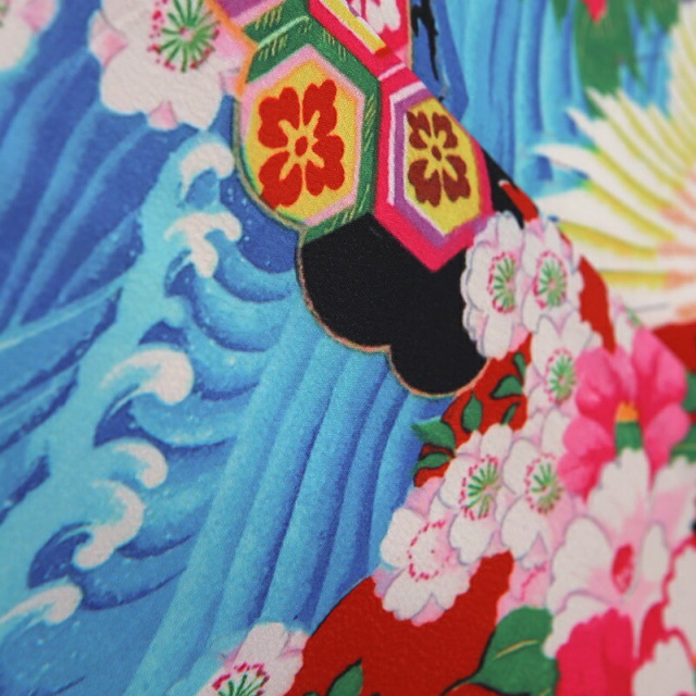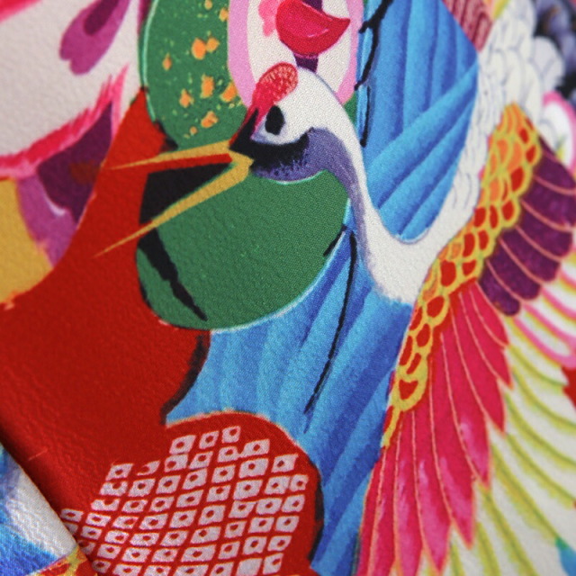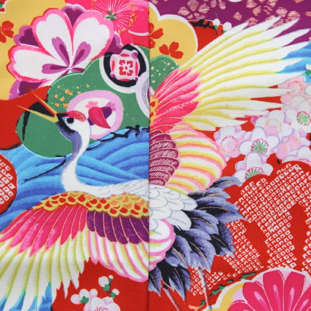 ビビットな色合わせが華やかで、目立つ事間違いなしのお祝い着です。色とりどりの文様は、おめでたい意味が込められたものばかり。「鶴」は、長寿の象徴とされてます。純白の羽をもつ鶴は、気品のある文様として親しまれてきました。おめでたいことの起こる前兆で現れる瑞鳥であるとも言われ、お祝いのシーンにぴったり。姿、色、香りが優れている「菊」は、太陽の形に似ていることから最も位の高い花とされてきました。長寿や不老不死の意味も込められます。「梅」は厳しい冬が終わると香り高い花をいち早く咲かすことから、逆境に負けない力強さを表しています。「牡丹」は、姿の美しさから「百花の王」とされており、富貴、高貴、幸福を表しています。「波」模様は、寄せては返す波の姿に、昔の人々は永遠の人生への願いを重ねていました。そして合わせる帯は「亀甲花菱」。亀モチーフにした六角形の中に花菱が描かれていて、亀は長寿を表しています。古典文様が隙間なく描かれていて非常に豪華なこちらの着物。モダンな雰囲気もあり、写真撮影で映えること間違いなし。大切なお祝いにぴったりの一着です。