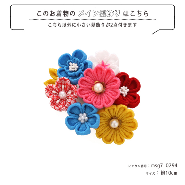 | コーディネート | 女の子七五三(7歳女の子用)に含まれる物:着物、長襦袢(カット袖)、作り帯、草履、バッグ、帯揚げ、箱迫、帯〆、しごき、末広(扇子)、足袋、腰紐(3本)、コーリンベルト、伊達締め、髪飾り |