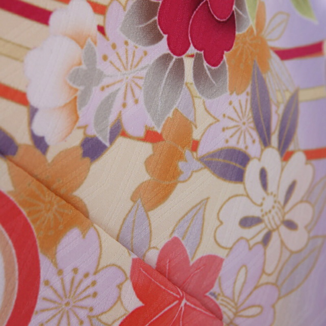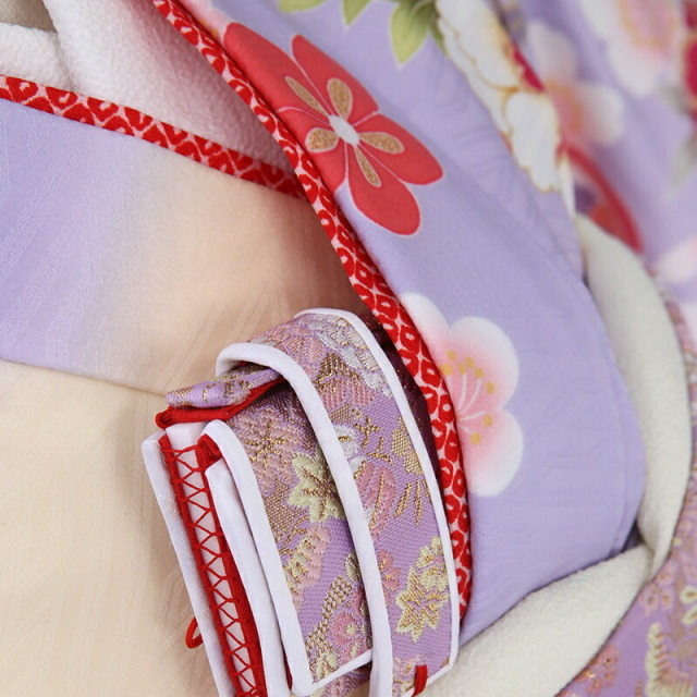柔らかい印象のパープルの地色に、古典的で可愛い文様を描きました。着物の地色は「薄藤(うすふじ)」。藤色をより薄くした淡い紫色のことです。平安の頃より日本女性の着物の色として人気で、お子様のお祝い着で使用することで大人っぽい装いをしていただけます。大きく描かれる「薬玉」は源氏物語にも登場し歴史が古く、元々は端午の節句に魔除けとして飾られたもの。薬草である菖蒲や蓮の花を編んで玉を作り、5色の糸を通して飾っていました。色彩豊かに花々が描かれており、不浄を払い邪気を避け、長寿を願う意味が込められています。「桜」は、咲き誇る姿から繁栄や豊かさを表しており、また春に咲くことから新しい門出を意味します。「菊」は、太陽の形に似ていることから、最も位の高い花とされてきました。長寿や不老不死の意味も込められます。「牡丹」は、姿の美しさから「百花の王」とされており、富貴、高貴、幸福を表しています。「梅」は、厳しい冬が終わるといち早く香り高い花を咲かすことから、逆境に負けない力強さを表します。古典的な色彩と文様と格式高いコーディネートに仕上がりました。