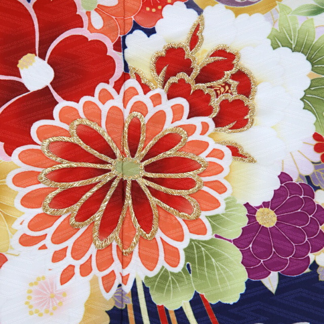 着物地の上品なブルーは「金青(こんじょう)」。紫色を帯びた暗い上品な青色のことです。そしてアイボリーの暈し染めが美しいお祝い着です。大きく描かれる「薬玉」は源氏物語にも登場し、歴史が古く、元々は端午の節句に魔除けとして飾られたもの。薬草である菖蒲や蓮の花を編んで玉を作り、5色の糸を通して飾っていました。色彩豊かに花々が描かれており、不浄を払い邪気を避け、長寿を願う意味が込められています。「桜」は、咲き誇る姿から繁栄や豊かさを表しており、また春に咲くことから新しい門出を意味します。「菊」は、太陽の形に似ていることから、最も位の高い花とされてきました。「牡丹」は、姿の美しさから「百花の王」とされており、富貴、高貴、幸福を表しています。「梅」は、厳しい冬が終わるといち早く香り高い花を咲かすことから、逆境に負けない力強さを表します。格調高く、古典的で王道なデザイン。大切な節目のお祝いには正統派な装いを着用していただきたいです。