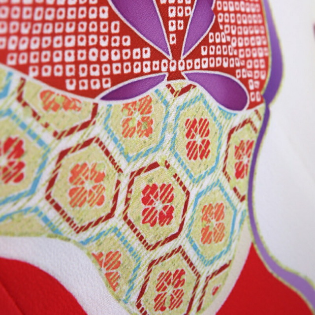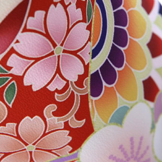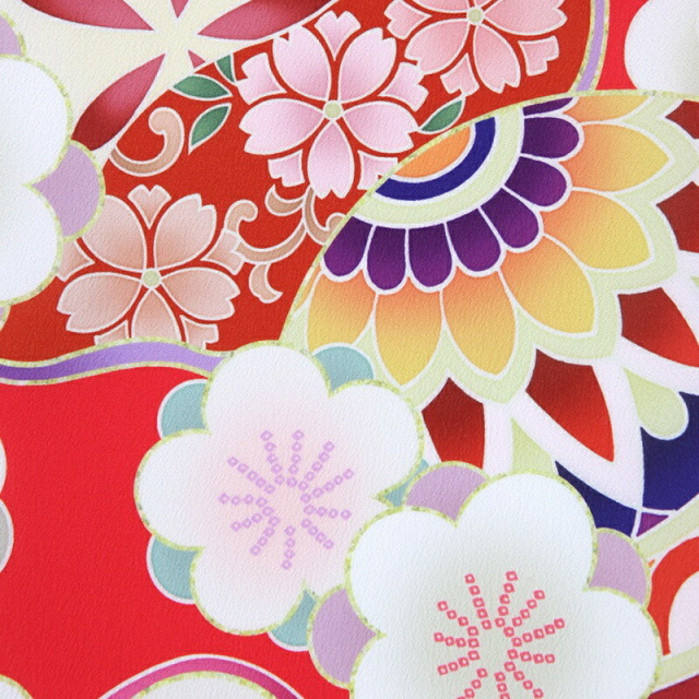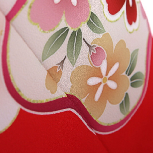 古来より女の子の晴れの場で用いられてきた「赤色」。赤色は厄除けの色をして古くから親しまれてきました。お祝いの色彩に、縁起のいい意味を込められた吉祥文様を合わせました。「梅」は、厳しい冬が終わるといち早く香り高い花を咲かすことから、逆境に負けない力強さ、生命力を表します。「桜」は、咲き誇る姿から繁栄や豊かさを表しており、また春に咲くことから新しい門出を意味します。「亀甲花菱」は、亀モチーフにした六角形の中に花菱が描かれていて、亀は長寿を表しています。日本の通過儀礼を伝える、正統派な装いに仕上がっているこちらのお祝い着。おめでたい意味が込められたおり、お子様の成長をお祝いする大切な日に相応しい装いです。