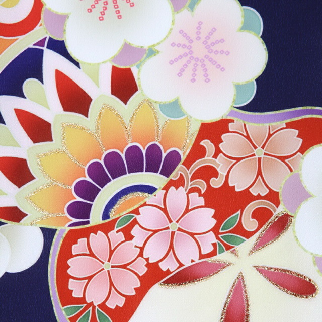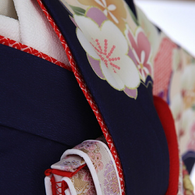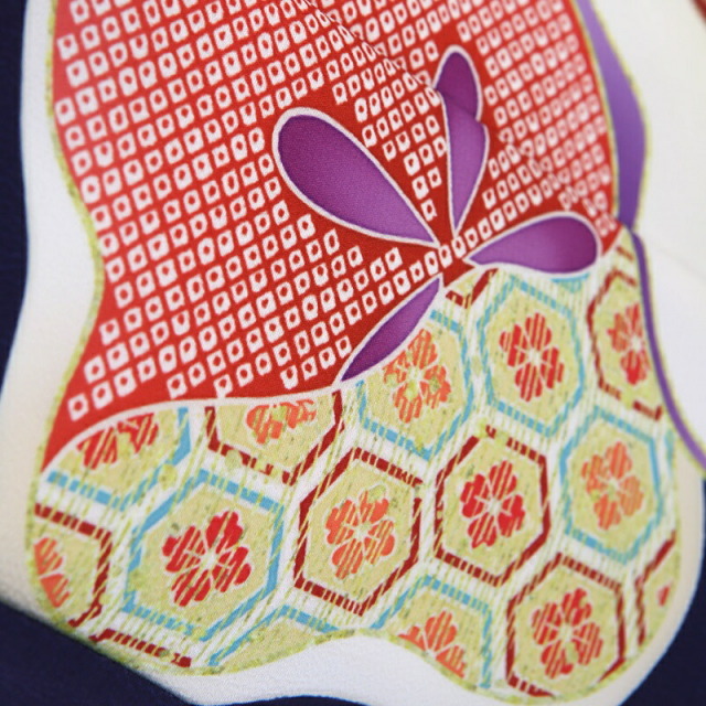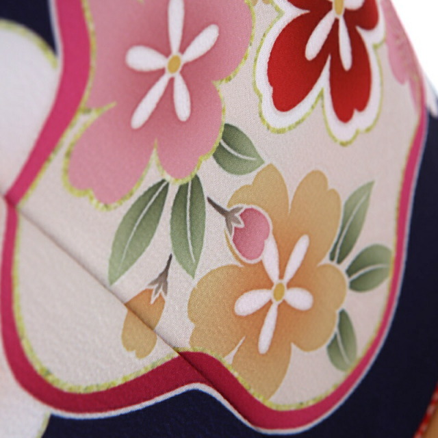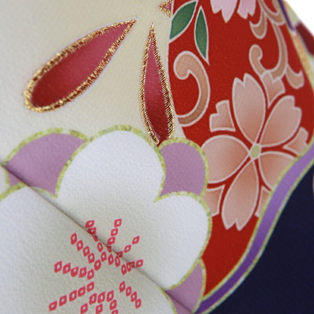 大人っぽいシックな地色ですが、愛らしい花々がよく映え、おめでたくはんなりとした印象を与えます。地色の濃い青紫色は「紺桔梗(こんききょう)」。桔梗色に紺を含ませた様な色味です。そこに明るい色彩で、おめでたい吉祥文様が描かれます。「梅」は、厳しい冬が終わるといち早く香り高い花を咲かすことから、逆境に負けない力強さ、生命力を表します。「桜」は、咲き誇る姿から繁栄や豊かさを表しており、また春に咲くことから新しい門出を意味します。「亀甲花菱」は、亀モチーフにした六角形の中に花菱が描かれていて、亀は長寿を表しています。ピンクや白の色使いが愛らしく、華やかに仕上がっています。お子様のお祝い着ですが、大人の着物と変わらないクオリティを感じます。重厚感のある一着です。