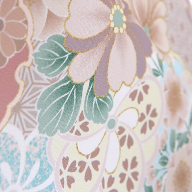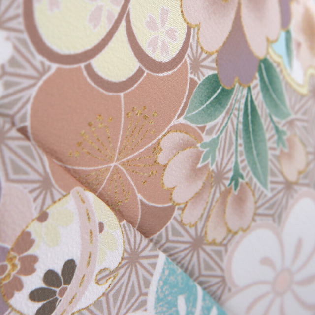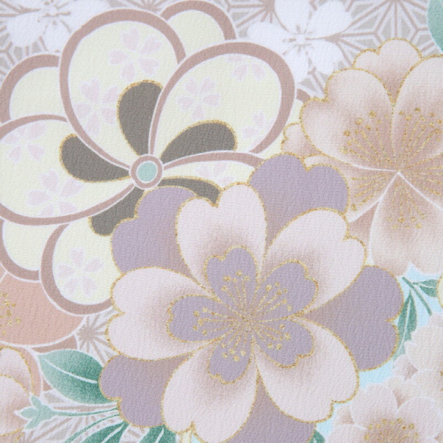 柔らかなベージュカラーに、可愛らしい文様が沢山描かれた非常に華やかなお祝い着です。「雪輪」という、雪の結晶を花に見立てた吉祥文様は、豊作や子孫繁栄を願って使われます。雪輪の中には繊細に花々が描かれていて、華やかで格調の高く、フォーマルシーンに是非着ていただきたいデザインです。「梅」は、冬が終わると香り高い花をいち早く咲かせることから、逆境に負けない力強さ、生命力を表しています。「菊」は、太陽のように咲く姿から最も位の高い花とされ高貴さをあらわしています。「桜」は、冬を越え咲き誇る圧巻の佇まいは、春がはじまる歓びをもたらします。幸先の良い物事のはじまりという前向きな意味が込められています。描かれる文様は、おめでたい吉祥文様ですが、大正ロマンのようなデザインは、古典すぎずに着用しやすいのでおすすめ。レトロでどこか懐かしさを感じるアンティークさがあり、非常におしゃれな装いです。