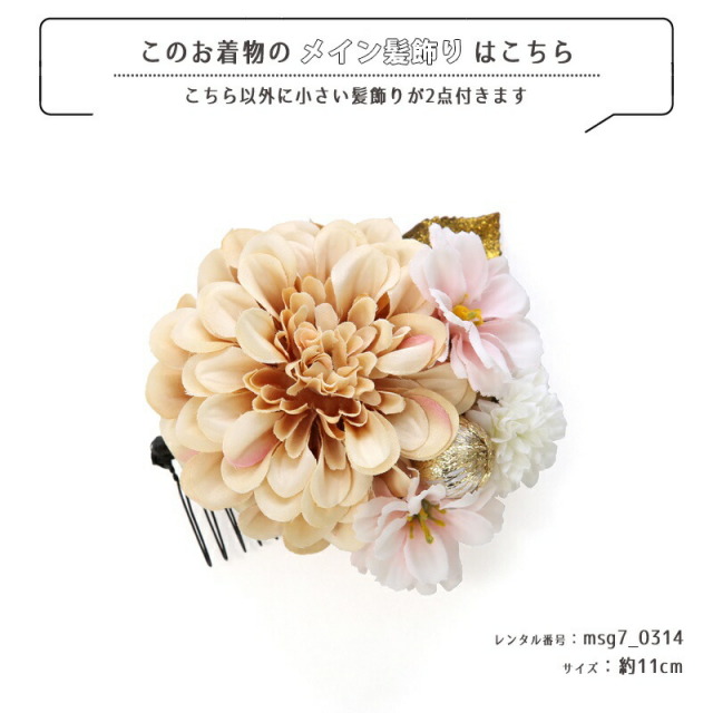 | コーディネート | 女の子七五三(7歳女の子用)に含まれる物:着物、長襦袢(カット袖)、作り帯、草履、バッグ、帯揚げ、箱迫、帯〆、しごき、末広(扇子)、足袋、腰紐(3本)、コーリンベルト、伊達締め、髪飾り |