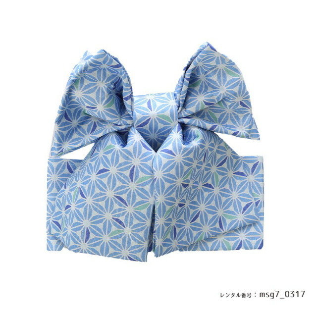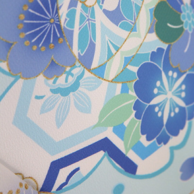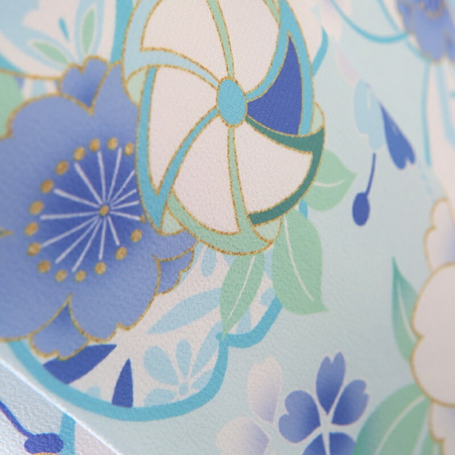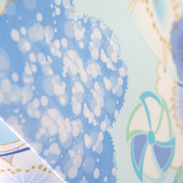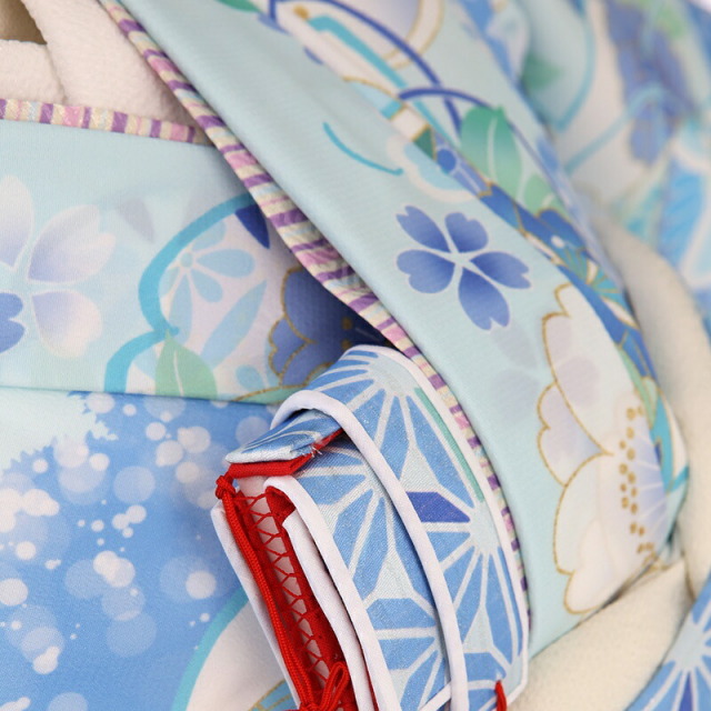 雨上がりの晴れた空のようなキラキラと輝くこちらのお祝い着。白色や爽やかなブルーが使用され、晴れやかな気持ちにしてくれます。描かれる文様はおめでたい吉祥文様ですが、レトロなタッチで描かれているので、お子様のお祝い着らしい可愛さがあります。「桜」は、冬を越え咲き誇る圧巻の佇まいは、春がはじまる歓びをもたらします。先の良い物事のはじまりという前向きな意味が込められています。丸くコロンとした形が可愛い「手毬」。手毬は平安時代に貴族の遊び道具だったことから高貴さや上品さの象徴とされています。また何事も丸く収まるように、丸く大きく成長しまうようにと願いが込められています。帯には「麻の葉」文様が描かれ、麻の丈夫さや成長の早さにあやかって子どもの健やかな成長を願う、お祝いの日にぴったりの文様です。お子様のこれからの輝く未来に向けて、大切な通過儀礼にふさわしい装いです。