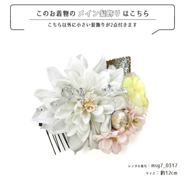 | コーディネート | 女の子七五三(7歳女の子用)に含まれる物:着物、長襦袢(カット袖)、作り帯、草履、バッグ、帯揚げ、箱迫、帯〆、しごき、末広(扇子)、足袋、腰紐(3本)、コーリンベルト、伊達締め、髪飾り |