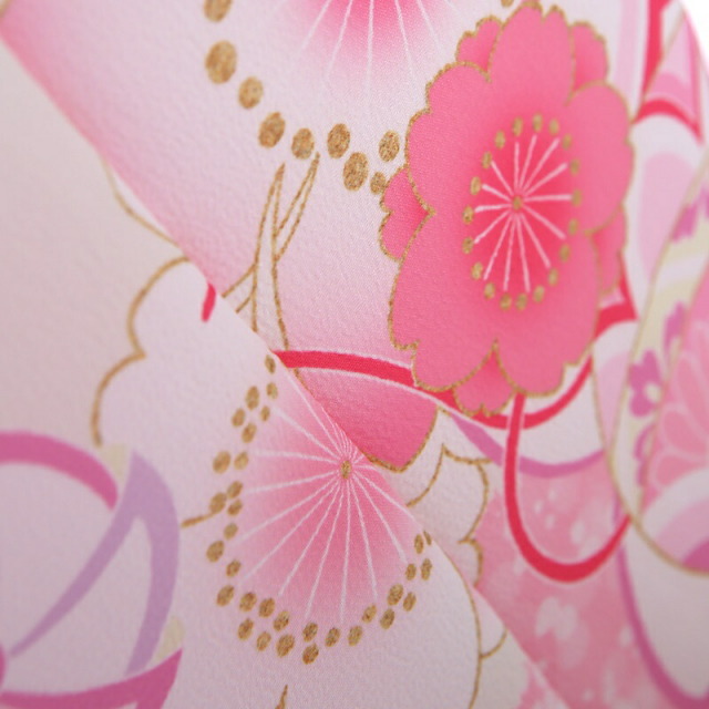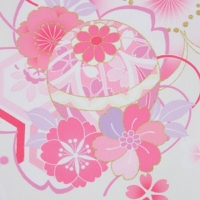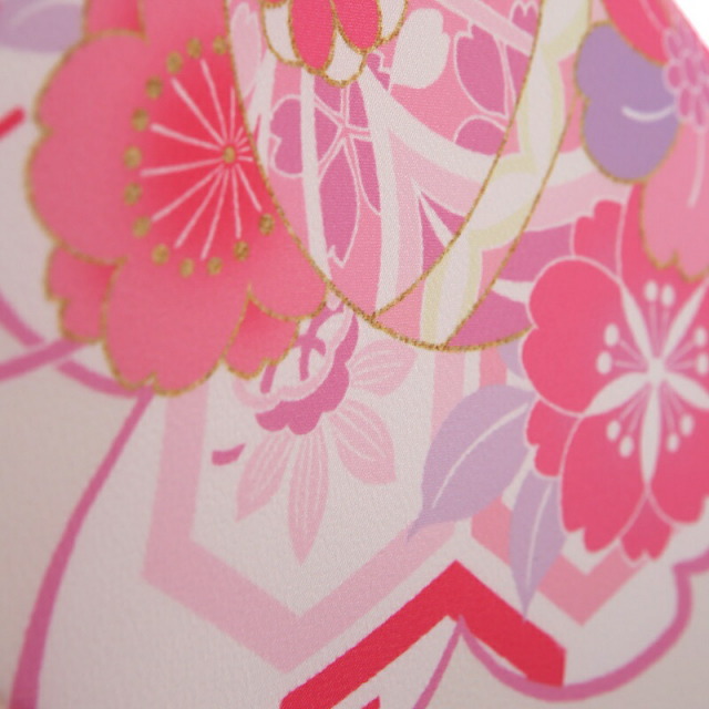 パッと目を引く桃色が華やかなこちらのお祝い着。柔らかさを感じる白色の着物地が、桃色の鮮やかさや可愛らしさをより一層引き立てます。地色に浮かび上がるように描かれるのは、おめでたい吉祥文様です。「桜」は、冬を越え咲き誇る圧巻の佇まいは、春がはじまる歓びをもたらします。先の良い物事のはじまりという前向きな意味が込められています。コロンとした形が可愛い「手毬」。手毬は平安時代に貴族の遊び道具だったことから高貴さや上品さの象徴とされています。また何事も丸く収まるように、丸く大きく成長しまうようにと願いが込められています。帯には「麻の葉」文様が描かれ、麻の丈夫さや成長の早さにあやかって子どもの健やかな成長を願う想いが込められています。女の子らしさ満点で、平安時代のお姫様になったような可憐さ。お祝いの想いや、これからの願いがこめられた一着です。