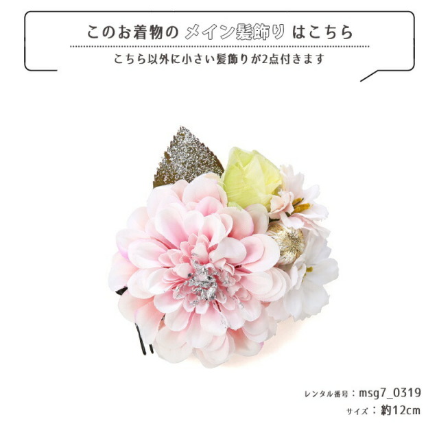 | コーディネート | 女の子七五三(7歳女の子用)に含まれる物:着物、長襦袢(カット袖)、作り帯、草履、バッグ、帯揚げ、箱迫、帯〆、しごき、末広(扇子)、足袋、腰紐(3本)、コーリンベルト、伊達締め、髪飾り |