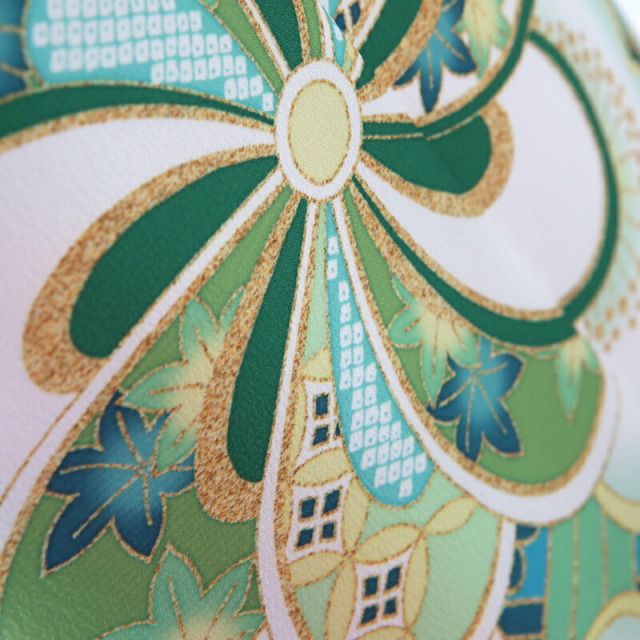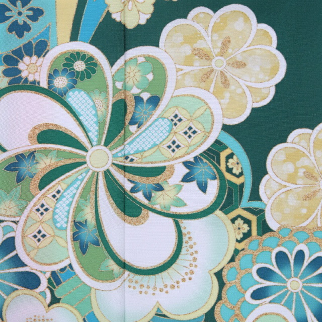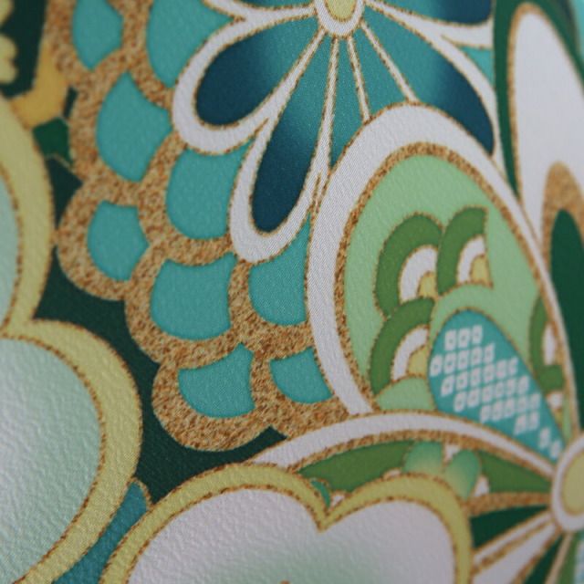 深みのある上品なグリーンは「常磐色(ときわいろ)」。松や杉などの常緑樹の葉の色のように茶みを含んだ濃い緑色のこと。「常磐」とは常に変わらないことを指す言葉で、長寿と繁栄の願いが込められた縁起のいい吉祥の色です。文様は古典的なものをレトロな雰囲気で可愛らしく描きます。「梅」は、冬が終わると香り高い花をいち早く咲かせることから、逆境に負けない力強さ、生命力を表しています。「菊」は、太陽のように咲く姿から最も位の高い花とされ高貴さをあらわしています。使用される色味も文様も、吉祥の意味がある古典的なものですが、他とは違った個性も感じるお洒落なデザインです。