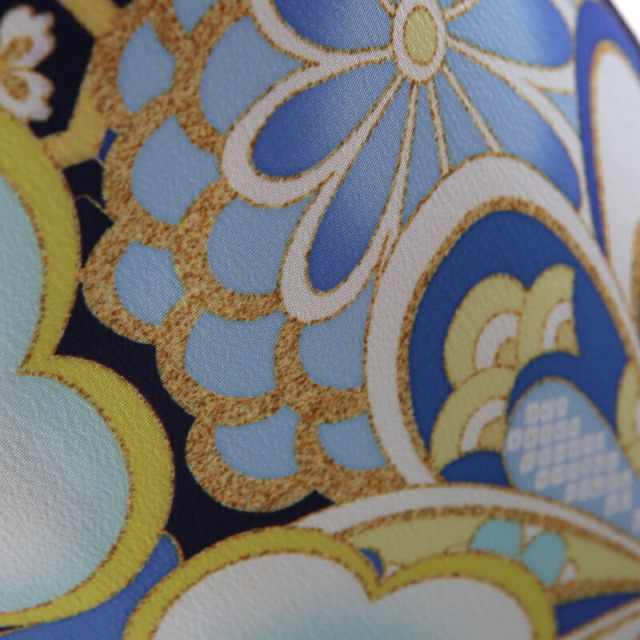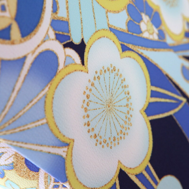 着物の地色、上品なブルーは「金青(こんじょう)」と呼ばれる伝統色。古代の顔料の色で紫色を帯びた暗い上品な青色のこと。献上品として記録が残るほど貴重な顔料で、仏像や仏画の彩色になくてはならないものとされてきました。このように歴史ある格調高き色彩が使用されています。そして文様も同じくブルー系で統一されており、すっきりとした着姿にしてくれます。レトロな雰囲気で描かれているのは、おめでたい意味が込められた吉祥文様。。「梅」は、冬が終わると香り高い花をいち早く咲かせることから、逆境に負けない力強さ、生命力を表しています。「菊」は、太陽のように咲く姿から最も位の高い花とされ高貴さをあらわしています。上品で深みのある大人っぽいカラーに、可愛らしさを感じる文様の描き方。これからどんどん大きくなっていくお子様にぴったりの装いで、お祝いの想いを着物に託せる、そんな一着です。