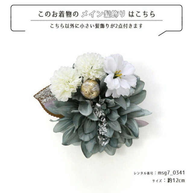| コーディネート | 女の子七五三(7歳女の子用)に含まれる物:着物、長襦袢(カット袖)、作り帯、草履、バッグ、帯揚げ、箱迫、帯〆、しごき、末広(扇子)、足袋、腰紐(3本)、コーリンベルト、伊達締め、髪飾り |