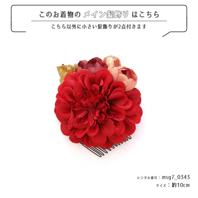 | コーディネート | 女の子七五三(7歳女の子用)に含まれる物:着物、長襦袢(カット袖)、作り帯、草履、バッグ、帯揚げ、箱迫、帯〆、しごき、末広(扇子)、足袋、腰紐(3本)、コーリンベルト、伊達締め、髪飾り |