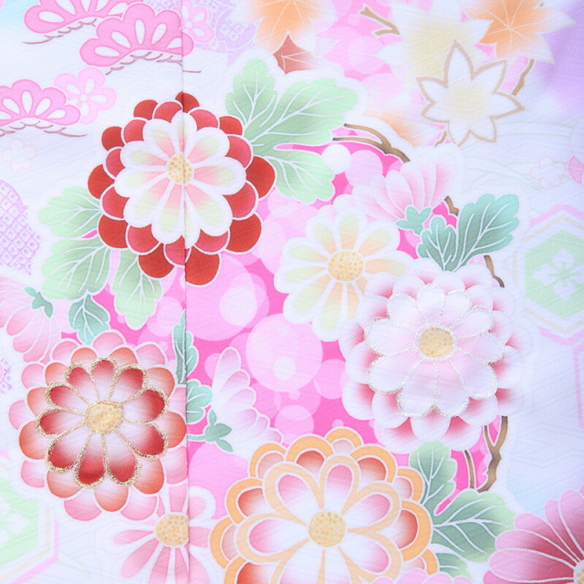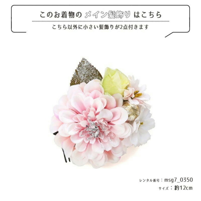 | コーディネート | 女の子七五三(7歳女の子用)に含まれる物:着物、長襦袢(カット袖)、作り帯、草履、バッグ、帯揚げ、箱迫、帯〆、しごき、末広(扇子)、足袋、腰紐(3本)、コーリンベルト、伊達締め、髪飾り |