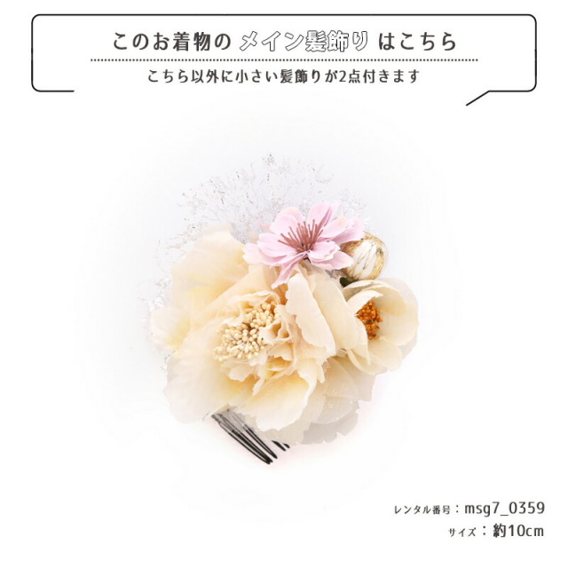 | コーディネート | 女の子七五三(7歳女の子用)に含まれる物:着物、長襦袢(カット袖)、作り帯、草履、バッグ、帯揚げ、箱迫、帯〆、しごき、末広(扇子)、足袋、腰紐(3本)、コーリンベルト、伊達締め、髪飾り |