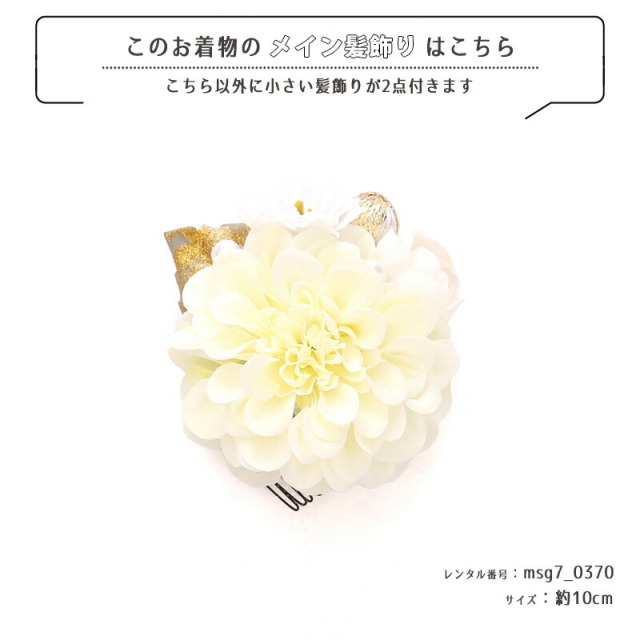 | コーディネート | 女の子七五三(7歳女の子用)に含まれる物:着物、長襦袢(カット袖)、作り帯、草履、バッグ、帯揚げ、箱迫、帯〆、しごき、末広(扇子)、足袋、腰紐(3本)、コーリンベルト、伊達締め、髪飾り |