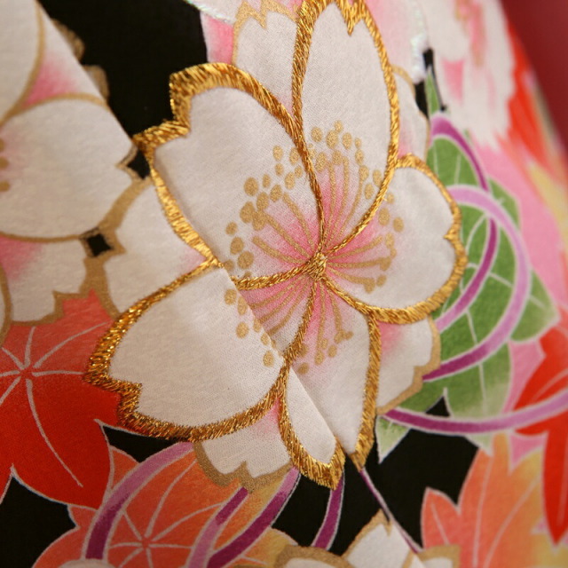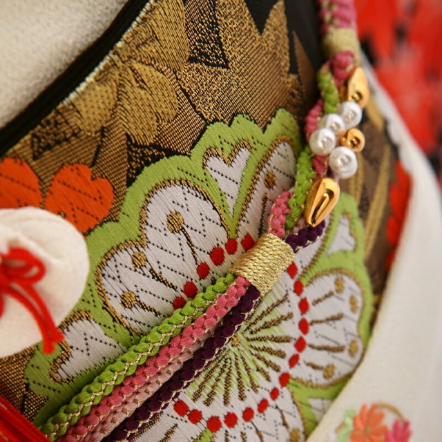 | コーディネート | 女の子七五三(7歳女の子用)に含まれる物:着物、長襦袢(カット袖)、手結び、草履、バッグ、帯揚げ、箱迫、帯〆、しごき、末広(扇子)、足袋、腰紐(3本)、コーリンベルト、伊達締め、帯まくら、板、衿芯、髪飾り |