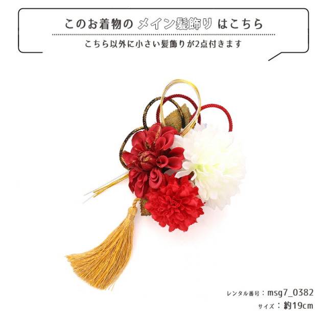| コーディネート | 女の子七五三(7歳女の子用)に含まれる物:着物、長襦袢(カット袖)、手結び、草履、バッグ、帯揚げ、箱迫、帯〆、しごき、末広(扇子)、足袋、腰紐(3本)、コーリンベルト、伊達締め、帯まくら、板、衿芯、髪飾り |