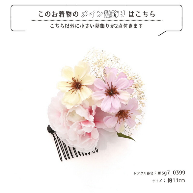 | コーディネート | 女の子七五三(7歳女の子用)に含まれる物:着物、長襦袢(カット袖)、作り帯、草履、バッグ、帯揚げ、箱迫、帯〆、しごき、末広(扇子)、足袋、腰紐(3本)、コーリンベルト、伊達締め、髪飾り |