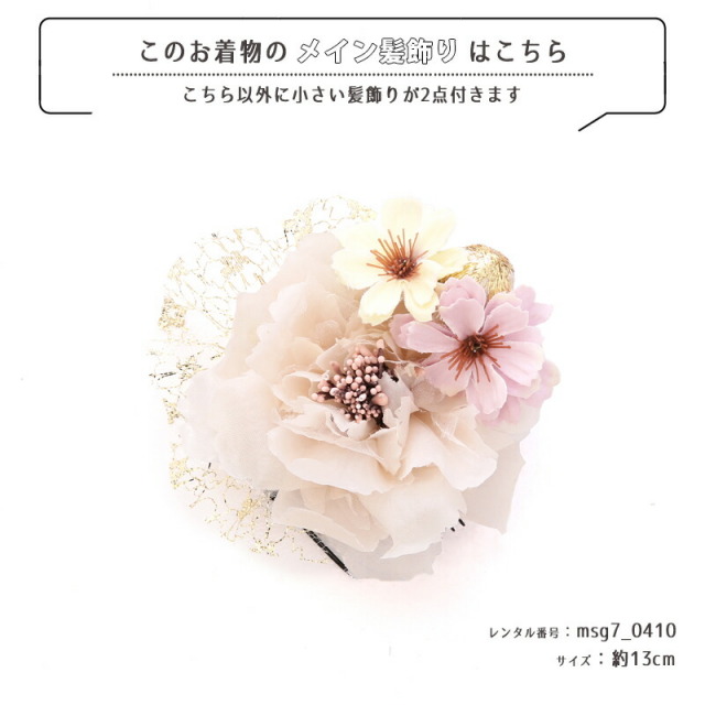 | コーディネート | 女の子七五三(7歳女の子用)に含まれる物:着物、長襦袢(カット袖)、作り帯、草履、バッグ、帯揚げ、箱迫、帯〆、しごき、末広(扇子)、足袋、腰紐(3本)、コーリンベルト、伊達締め、髪飾り |