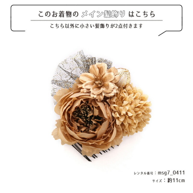 | コーディネート | 女の子七五三(7歳女の子用)に含まれる物:着物、長襦袢(カット袖)、作り帯、草履、バッグ、帯揚げ、箱迫、帯〆、しごき、末広(扇子)、足袋、腰紐(3本)、コーリンベルト、伊達締め、髪飾り |