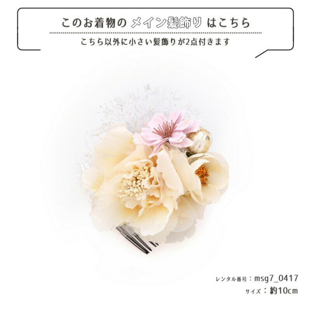 | コーディネート | 女の子七五三(7歳女の子用)に含まれる物:着物、長襦袢(カット袖)、作り帯、草履、バッグ、帯揚げ、箱迫、帯〆、しごき、末広(扇子)、足袋、腰紐(3本)、コーリンベルト、伊達締め、髪飾り |