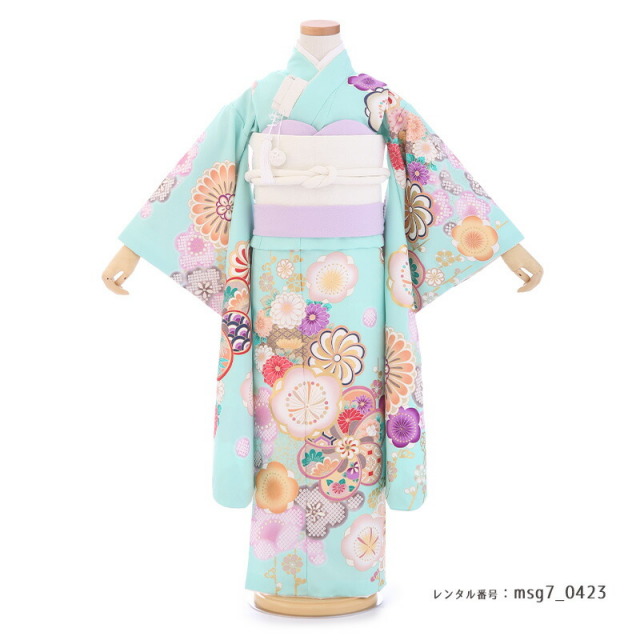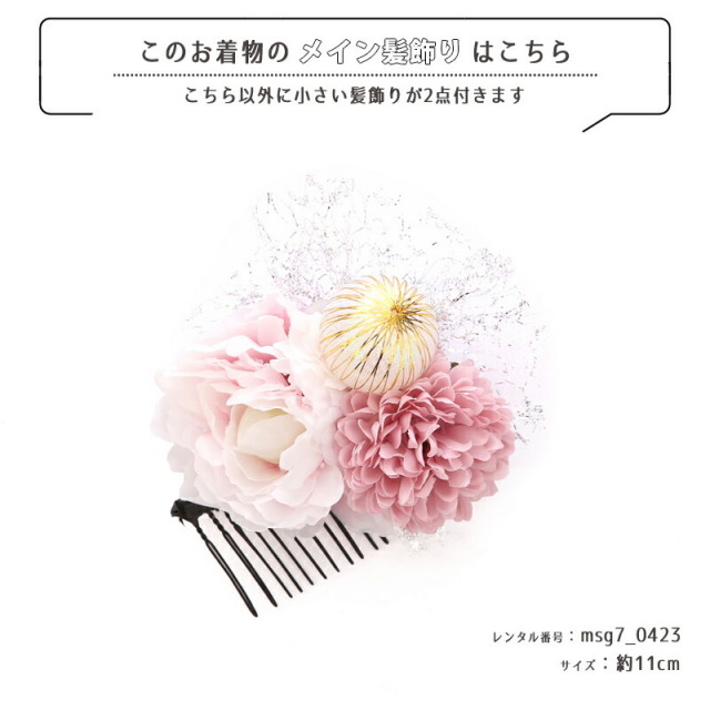 | コーディネート | 女の子七五三(7歳女の子用)に含まれる物:着物、長襦袢(カット袖)、作り帯、草履、バッグ、帯揚げ、箱迫、帯〆、しごき、末広(扇子)、足袋、腰紐(3本)、コーリンベルト、伊達締め、髪飾り |