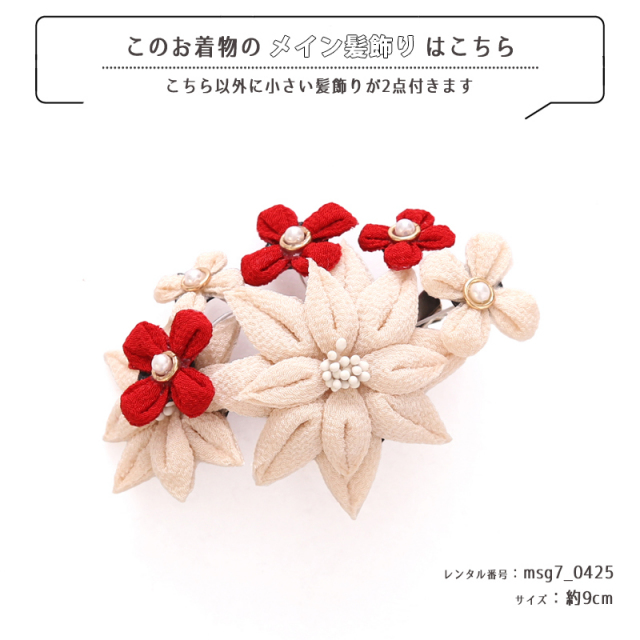 | コーディネート | 女の子七五三(7歳女の子用)に含まれる物:着物、長襦袢(カット袖)、作り帯、草履、バッグ、帯揚げ、箱迫、帯〆、しごき、末広(扇子)、足袋、腰紐(3本)、コーリンベルト、伊達締め、髪飾り |
