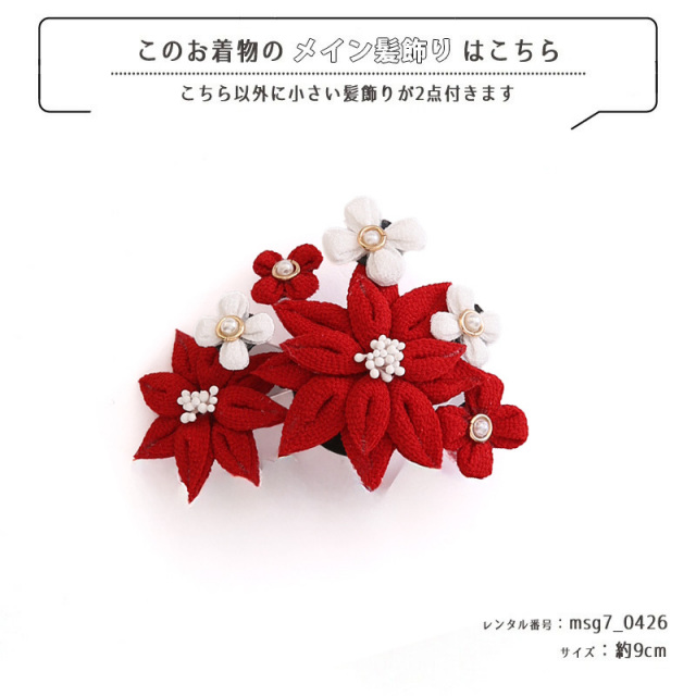 | コーディネート | 女の子七五三(7歳女の子用)に含まれる物:着物、長襦袢(カット袖)、作り帯、草履、バッグ、帯揚げ、箱迫、帯〆、しごき、末広(扇子)、足袋、腰紐(3本)、コーリンベルト、伊達締め、髪飾り |