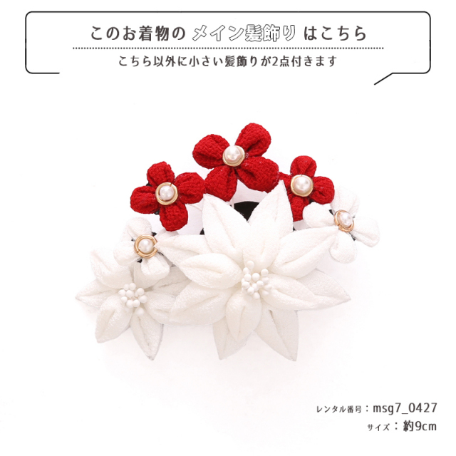 | コーディネート | 女の子七五三(7歳女の子用)に含まれる物:着物、長襦袢(カット袖)、作り帯、草履、バッグ、帯揚げ、箱迫、帯〆、しごき、末広(扇子)、足袋、腰紐(3本)、コーリンベルト、伊達締め、髪飾り |