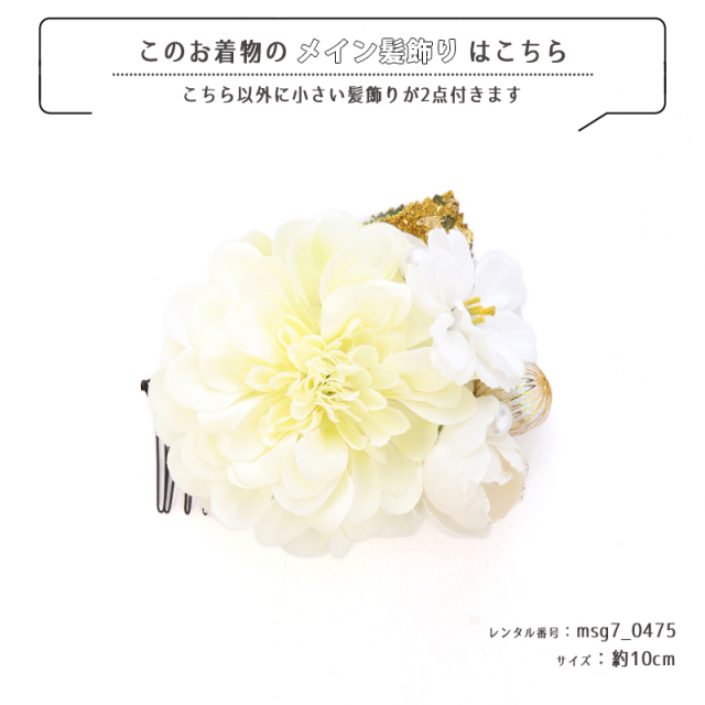| コーディネート | 女の子七五三(7歳女の子用)に含まれる物:着物、長襦袢(カット袖)、作り帯、草履、バッグ、帯揚げ、箱迫、帯〆、しごき、末広(扇子)、足袋、腰紐(3本)、コーリンベルト、伊達締め、髪飾り |