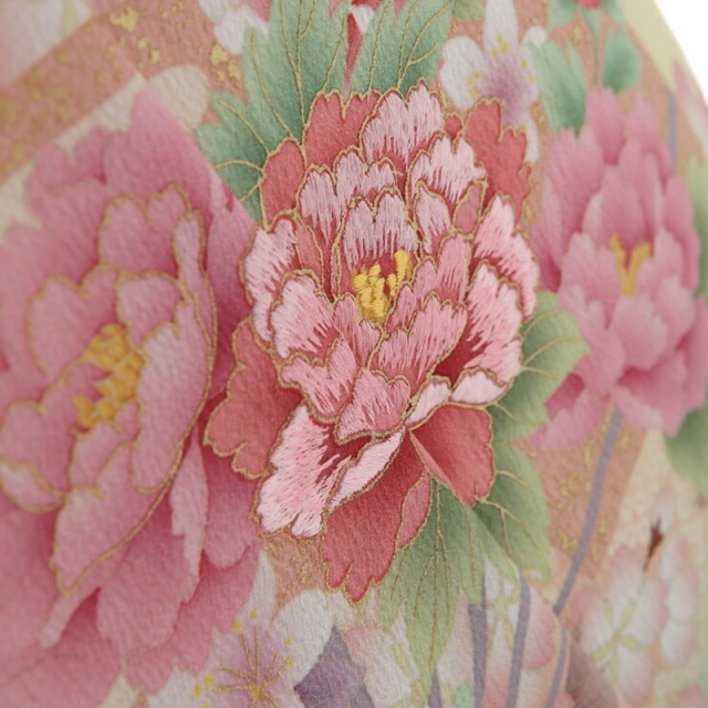 クリーム色のお着物にたくさんのお花が華やかに描かれた訪問着です。描かれているお花は、さくら、菊、ぼたん、ききょうなど、四季折々の美しい花々。さくらやきくなどは白やピンクなどの暖色系のカラーで彩られ、女性らしさや優しさを感じられる雰囲気になっています。そこにききょうの寒色系が差し色となっていてます。おとなかわいいだけではない、ちょっとクールな雰囲気もすてきなポイントです。真ん中に描かれているのはぼたんのお花。濃淡のあるピンク色がとても美しいですね。ぼたんはその美しさや華やかさから、百花の王とも言われている花です。女性のお着物のモチーフとしても古くから愛されてきたもの。こちらの訪問着では、花びらのふちどりや葉の葉脈に金の細工がされていています。さらに、花びらにはピンクや白の糸で刺繍もほどこされています。染めと刺繍でグラデーションが表現されているので、ぼたんの美しさや華やかさがいっそう引き立つデザインとなっています。このぼたんの近くに直線のラインが何本か入っているの見えますが、これは扇の一部です。扇は末広(すえひろ)ともいい、縁起のよいモチーフのひとつです。その扇にぼたんやさくらの花がのっているデザインになってます。クリーム色のお着物にも花々がよく映えて、とても華やぎのある訪問着です。