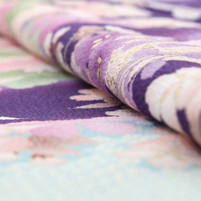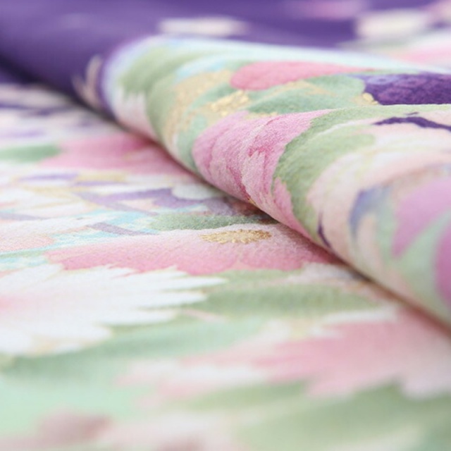 高貴な色と言われる紫色のお着物にたくさんのお花があでやかな訪問着です。描かれているお花は、さくら、菊、ぼたん、ききょうなど。さくらやきくなどは白やピンクなどの暖色系のカラーで描かれ、紫のお着物の色によく映えます。真ん中にはぼたんのお花が大きく描かれています。濃ピンク色がとても華やかですね。ぼたんはその美しさから、百花の王とも言われている花です。こちらの訪問着では、花びらのふちどりや葉の葉脈に金の加工がほどこされていています。花びらにはピンクや白の糸で刺繍もされています。刺繍でもグラデーションが表現されていて、とても手がこんでいます。刺繍がされていると華やかさに加えて豪華なイメージになりますね。ぼたんの近くに直線が何本か入っています。これは扇の一部で、扇の上にぼたんやさくらの花がのっているデザインになってます。扇は末広(すえひろ)ともいわれ、縁起のよいモチーフです。後ろ側にもこの花扇が描かれています。正面とはちょっとちがったデザインですが、後ろ姿も華やかな訪問着です。