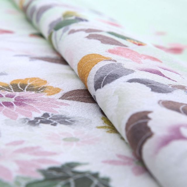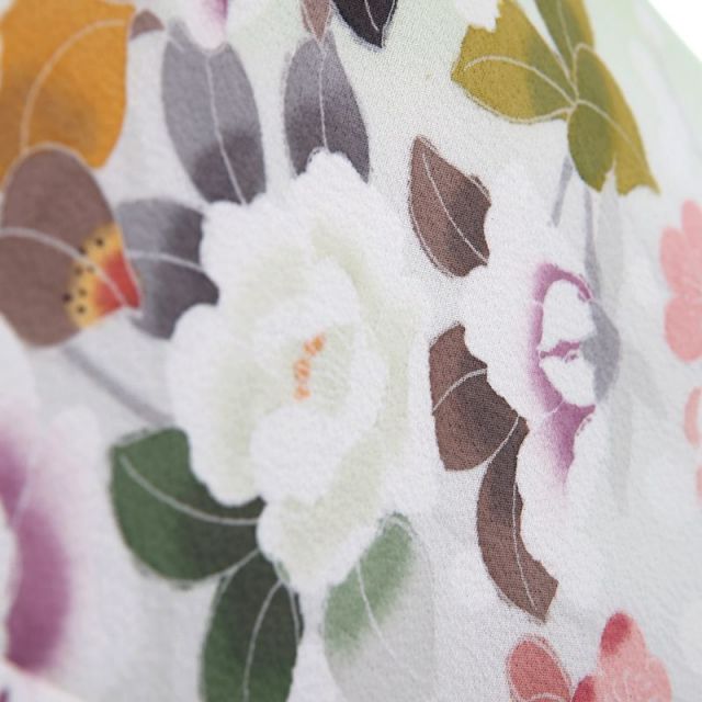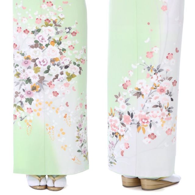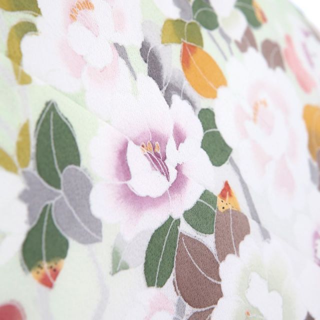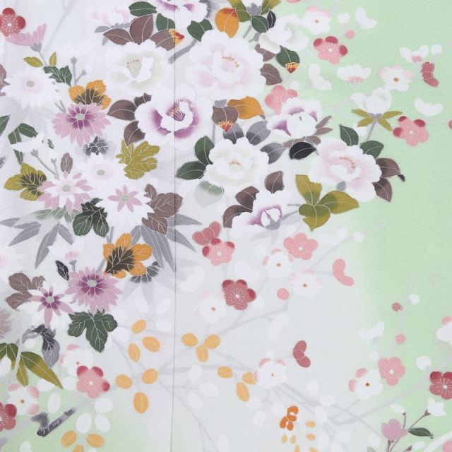 フレッシュかつ柔らかいグリーンの地色に、春秋の花々を描いた、柔和な雰囲気ながら華やかさもある訪問着です。地色は、肌色を選ばず顔を明るく見せてくれる、フレッシュグリーン。そんな地色の上に、牡丹、梅、桜、菊、萩、桔梗といった春秋の花々を描いています。花々は紫、ピンク、黄、緑と色とりどりですが、そのどれもがややグレイッシュな色味のため、絵柄のボリュームの割に控えめな印象に仕上がっています。特定の季節の植物を描いたものではないので、季節を問わずお召しいただけますね。地に白のぼかしがほどこされており、また、絵柄にも白が多く使われているため、柄が重くなることなく、小柄な方でもすっきりとした着姿に仕上がります。特に、後ろ身頃は、縦に入ったぼかしと絵柄の斜めに流れるラインの効果で、帯締めなどの小物も見えずめりはりをつけづらい後ろ姿をすっきりと見せてくれます。礼装、盛装としての華やかさが欲しいけれども、あくまで品良く場面に華を添えたい、そんな方にお薦めの装いです。