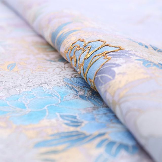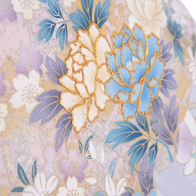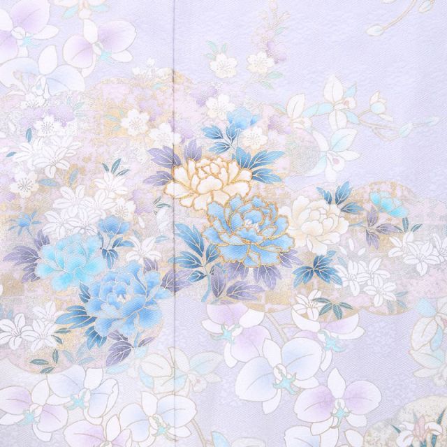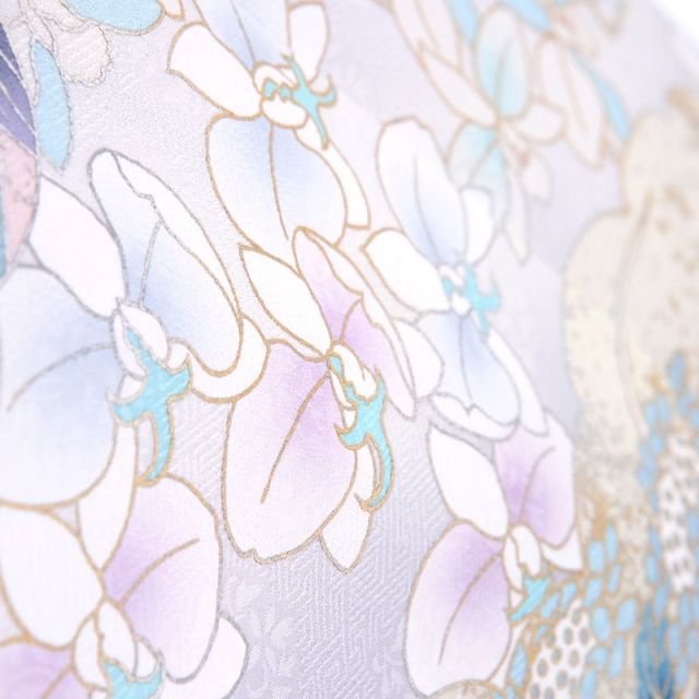 冷んやりと冴えた水色地に牡丹と胡蝶蘭を中心に描き、藤や菊などの花も添えられた、幻想的な雰囲気のある訪問着です。地色は、大人の女性の美しさを演出するクールな水色。そんな地色の上に、メインで描かれているのは、牡丹と胡蝶蘭の花です。牡丹は、着物などの日本文化においては百花の長に君臨する花、富と美しさを象徴する富貴(ふき)の花と言われます。胡蝶蘭は、華やかな蘭の中にあって蘭の女王とされ、圧倒的な華やかさを誇る花、お祝いごとに贈る花の代表でもありますね。姿かたちだけでも豪華なこれらの花ですが、牡丹に用いられた鮮やかなブルーと金糸の刺繍、ところどころほどこされた金彩が、全体を一層華やかに仕上げています。牡丹と胡蝶蘭の組み合わせで和洋折衷の空気を持つデザインではありながら、彩色と金際で牡丹の方が目立っていること、周囲に描かれた花がいずれも和花であることから、和風の場面でのご着用にも違和感なく馴染んでくれることでしょう。大人の華やかさを演出できる装いをお探しの方にお薦めです。