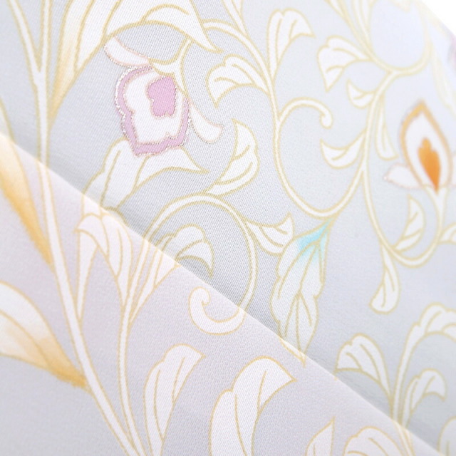 唐華文様に、古典とモダンの双方の雰囲気が共存し、着用の場面を選ばない、万能といえる訪問着です。地色は、爽やかなミント色をメインに、裾にかけてはクールな薄グレイ色のぼかし。その上に、お端折り(おはしょり)近くまでたっぷりと、唐華文様を描いています。唐華は、その名の通り中国から伝来した花模様。特定の花ではなく空想上の花の文様で、古く飛鳥時代から奈良時代の頃には既に見られる文様です。この時代の多くの文様に見られる特徴ですが、大陸由来のため、エキゾチックな雰囲気を感じさせます。文様はたっぷりと描かれているものの、唐華部分の色が地色と同系色であること、文様のほとんどが白で描かれていることから、とてもすっきりした印象です。唐華文様の持つ古典の雰囲気とモダンの雰囲気のバランス、柄付けのたっぷりさと柄の白色のあっさりさのバランス。これらのバランスの良さと、季節感のなさにより、幅広い場面でお召しいただけます。お色や文様にひかれた方にも、どのような着物なら周囲と調和するのか迷われている方にも、自信を持ってお薦めしたい訪問着です。