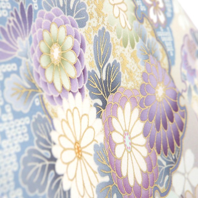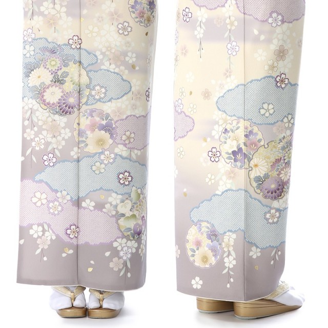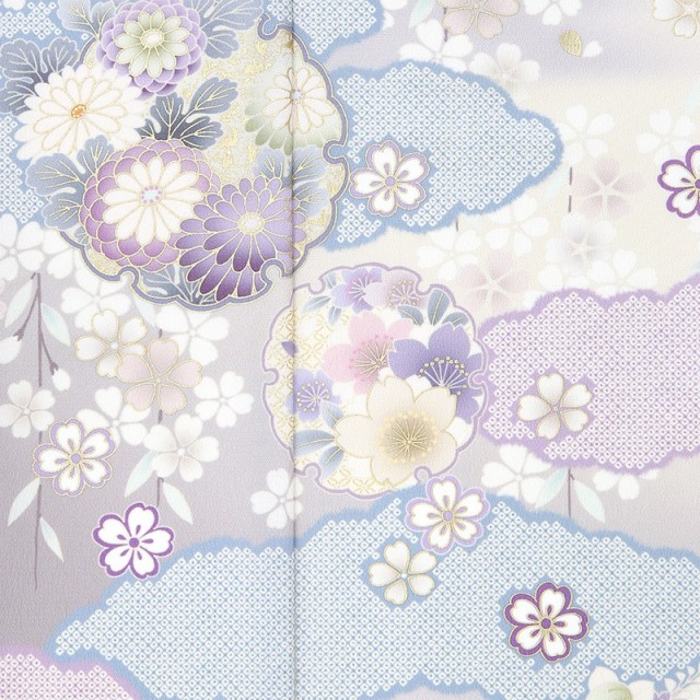 「鳥の子色」という綺麗なペールイエローが明るく可愛らしい印象を与えてくれます。裾の部分は水色に少し薄紫を混ぜたような「淡藤色」を基調として染め上げています。こちらは平安時代から人気の色味で、藤の花が愛されたのと同様に、藤色の着物も好まれたそうです。女性らしくふわっと清楚で、主張が強すぎない控えめさが魅力です。全体的に淡い優しい色味ですが、デザインが単調にならず、吉祥文様が沢山描かれており、とてもこだわりのある訪問着です。「雪輪」という、雪の結晶を花に見立てた吉祥文様は、豊作や子孫繁栄を願って使われます。雪輪の中には「桜」「菊」「葵」などの花が繊細に描かれていて、華やかで格調の高く、フォーマルシーンに是非着ていただきたい一着です。そしておめでたいことが起こる前兆に現れる「瑞雲」を、絞り柄で描くことで、更に繊細な印象を与え、奥行きが出て、全体を格上げをしてくれます。色味、柄とともに古くから愛されるものを使い、正統派に仕上げているので、上品で落ち着いた大人の女性らしい着姿へと演出します。
