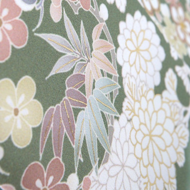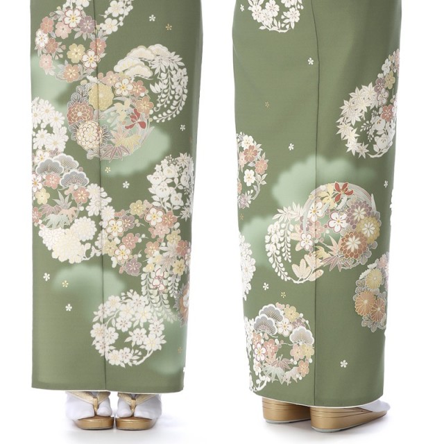 こちらの訪問着は「草色」と呼ばれるくすんだ黄緑で、大人っぽくシックな印象を与えます。イメージは若草が成長して深く濃くなったような緑色。落ち着いた雰囲気ですが、文様がさまざまな色で描かれているので、地味にならず、フォーマルの席で華やかに着ていただけます。沢山の色味が使われているといっても、どれもくすみカラーなので全体的に統一感があり、まとまりが良くセンスの良さを感じます。文様は「花丸紋」が描かれ、落ち着いた地色だからこそ映える四季折々の草花がとても美しい仕上がりになっています。季節が変わっても緑を絶やさない「松」、青々とまっすぐに伸びる「竹」、冬の寒さからいち早く花を咲かせる「梅」という逆境でも力強い松竹梅。古くからおめでたい柄として欠かせません。また高貴な「牡丹」や、長寿を現す「藤」も描かれています。初めと終わりが無い丸紋は「両家の和」「縁」への想いが強く込められています。古くから続く吉祥文様で縁起の良い柄になりますので、格調高い装いをしていただけます。