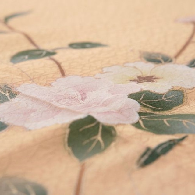芥子色(からしいろ)のお着物に純白の牡丹が映え映えしい訪問着になります。牡丹といえば、「立てば芍薬、座れば牡丹、歩く姿は百合の花」という言葉があるように、女性の美しさを表現する代表的な花ですよね。牡丹は豪華な見た目から富貴の象徴であり、“百花の王”といわれます。また縁起の良い吉祥文様の1つです。牡丹柄はその豪華な花を強調させるように、花弁が大きく華麗な花の柄として描かれた着物が多くみられます。しかしこちらの訪問着は異なります。お着物の芥子色に咲くのは純白の牡丹。すがすがしい白い花は豪華というよりは神聖な雰囲気を漂わせています。そして花だけでなく瑞々しい緑の枝葉も描かれ、お着物の中で実際に咲いているかのように生き生きとしています。お着物の裾にかけて濃い芥子色になるグラデーションが施されており、裾線近くで咲く牡丹は、より白い花と緑の葉が映えるので凛とした美しさを放っていますね。ゴージャスな美しさをまとう牡丹の文様は、婚礼の意匠や振袖に人気の古典柄であるのもうなずけますが、どちらかといえば若い女性が装うことが多いイメージがあります。一方こちらの訪問着は、大人の女性に似つかわしい気品ある清楚な牡丹といったところでしょうか。古典柄としての牡丹の印象をがらりと変える斬新な意匠です。ピュアな純白の牡丹柄を大人の女性によって清楚で気品ある装いに。そんな粋な着こなしをしてみるのも素敵ですよ。