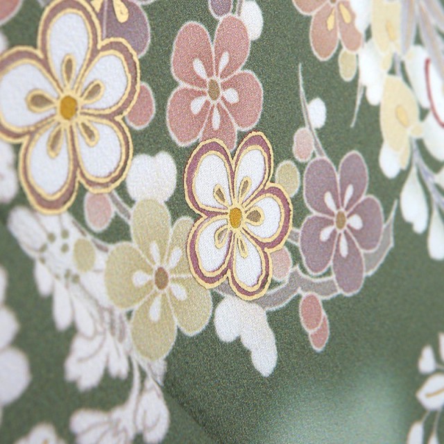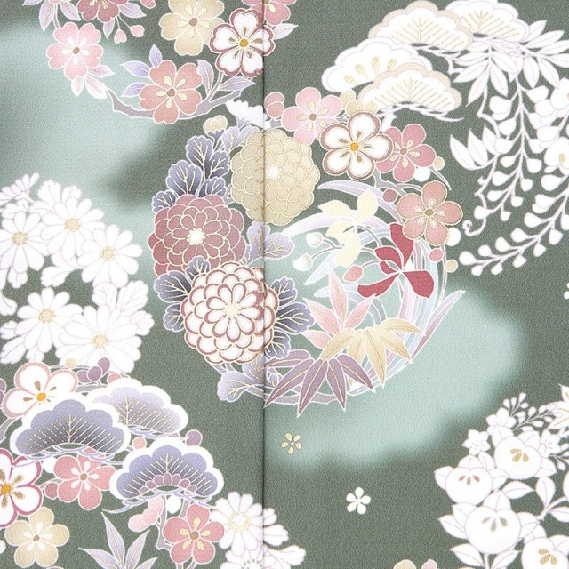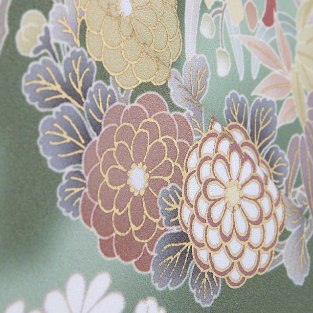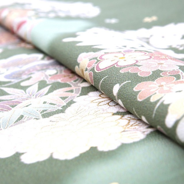 こちらの訪問着は「草色」と呼ばれるくすんだ黄緑で、大人っぽくシックな印象を与えます。イメージは若草が成長して深く濃くなったような緑色。落ち着いた雰囲気ですが、文様がさまざまな色で描かれているので、地味にならず、フォーマルの席で華やかに着ていただけます。沢山の色味が使われているといっても、どれもくすみカラーなので全体的に統一感があり、まとまりが良くセンスの良さを感じます。文様は「花丸紋」が描かれ、落ち着いた地色だからこそ映える四季折々の草花がとても美しい仕上がりになっています。季節が変わっても緑を絶やさない「松」、青々とまっすぐに伸びる「竹」、冬の寒さからいち早く花を咲かせる「梅」という逆境でも力強い松竹梅。古くからおめでたい柄として欠かせません。また高貴な「牡丹」や、長寿を現す「藤」も描かれています。初めと終わりが無い丸紋は「両家の和」「縁」への想いが強く込められています。古くから続く吉祥文様で縁起の良い柄になりますので、格調高い装いをしていただけます。