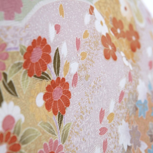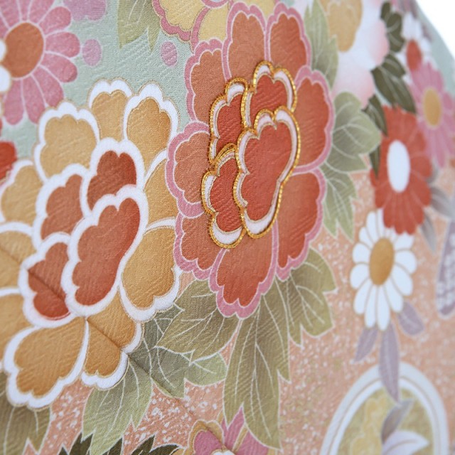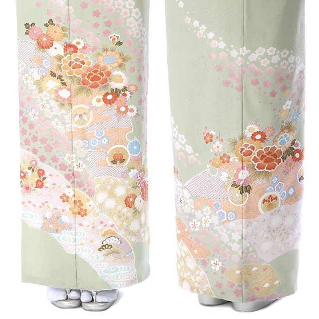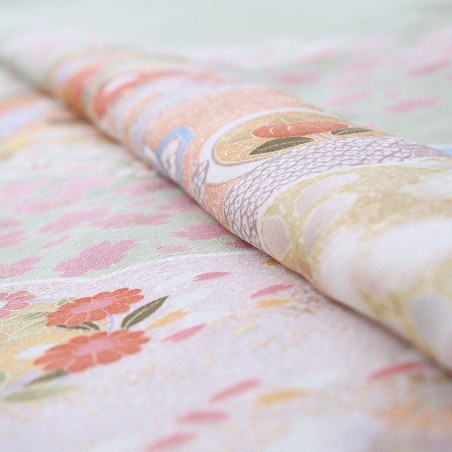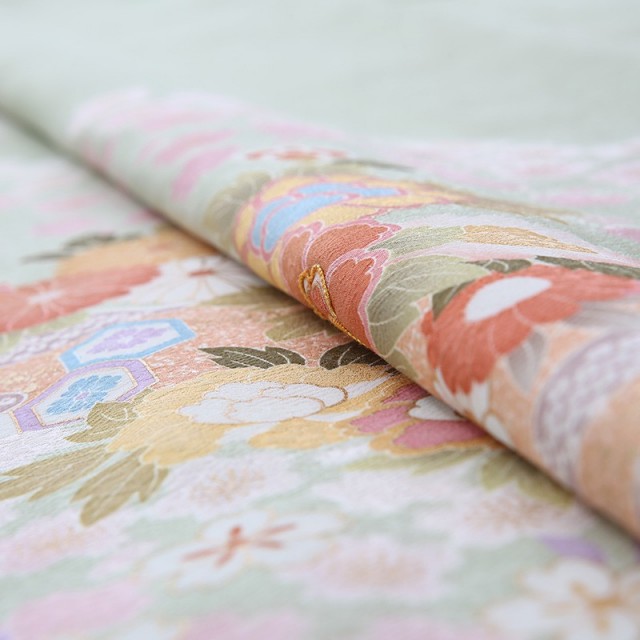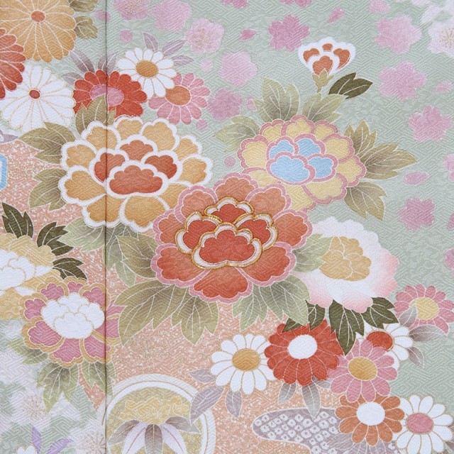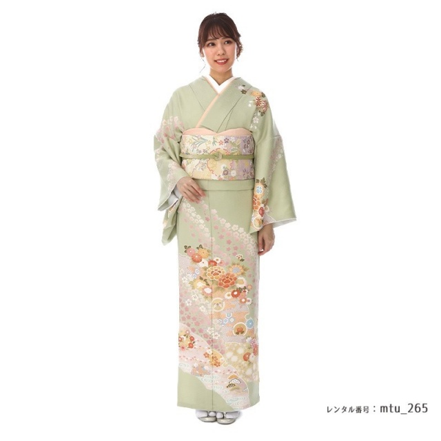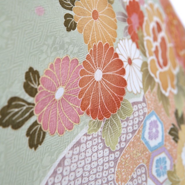 柔らかな色味のきものは、大切なフォーマルなシーンに相応しい装いとなります。着物地の淡いグリーンは「裏葉柳(うらはやなぎ)」と呼ばれる、淡い黄みを含んだ緑色のことです。柳の葉っぱの裏側の薄い緑色を表現した染めの色で、上品で柔らかいカラーです。文様は豪華な花々が流れるように描かれます。「牡丹」は、姿の美しさと豪華さから「百花の王」とされ、富貴、高貴、幸福を表しています。「菊」は、花の形から太陽を連想させ、最も位の高い花とされ皇室の家紋としても使われています。また邪気を払い、長寿と保てるとされています。そして満開の「桜」。咲き誇る姿から繁栄や豊かさを表しており、また春に咲くことから新しい門出を意味します。おめでたい意味が込められた色とりどりの花々が沢山描かれるこちらの訪問着。使用される色味も上品で大人可愛い装いをしていただけます。可愛すぎずに控えめ、しかし華やか、そんな絶妙な雰囲気が魅力の一着です。