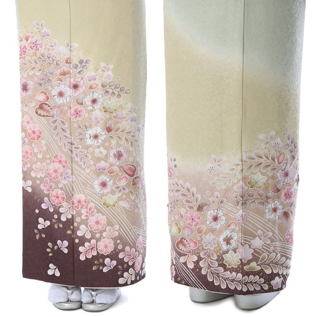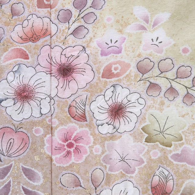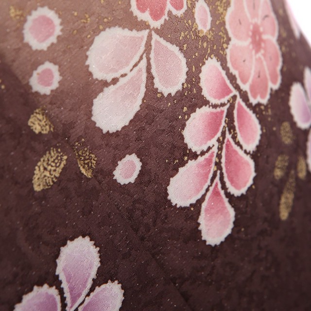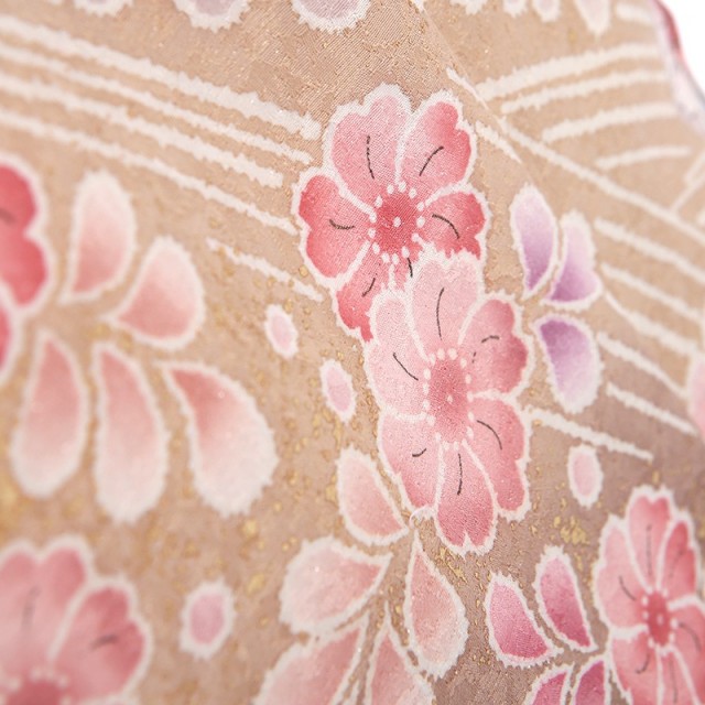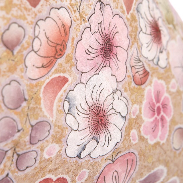 華やかな場、日常のお祝い事にも着用できる装いです。淡く優しい着物地の黄色は「淡黄蘗(うすきはだ)」と呼ばれる伝統色。明るいのに儚げな雰囲気のある「淡黄蘗」は、まるで暗い水平線から顔を出したばかりの月の色のようだと表現されます。裾の赤茶色は「海老茶(えびちゃ)」。伊勢海老のような色でアクセントカラーになっています。文様は、高級着物「辻が花」を彷彿させる描き方です。辻が花は人気が高く豪華な印象が魅力的な文様です。描かれる花々は特定されるものではなく、抽象的に描かれているので季節を問わずに着用していただけます。流れるように花や草木が描かれていて、様々な花が交わり華やか。ピンク系で統一感があり、可愛らしさも感じます。さりげない華やかさが魅力なこちらの訪問着。幻想的な世界観で、個性的な装いが出来る一着です。