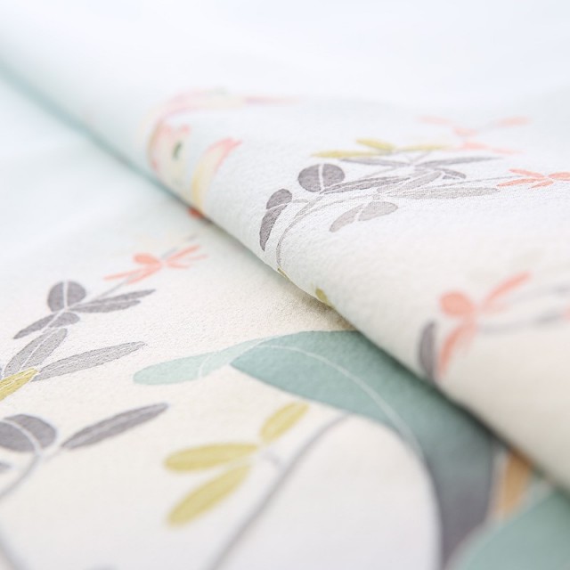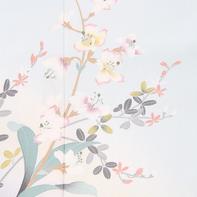 透明感のある色味に、可憐な花々が描かれた可愛らしい一着です。着物地の色味は、「青白磁(せいはくじ)」。雲がかすむ春の空のような、うすく淡い青緑色のことです。その名のとおり焼き物の「青白磁」の青みを帯びた美しい肌色に由来しています。裾の淡い紫色は「白菫色(しろすみれいろ)」。白菫の花のようなカラー。菫の花は万葉の頃より愛された草花で、現在でも女性の着物の色として大変好まれています。そして、可愛い花々が描かれます。特定されるものではないので、季節を問わずに気軽に着用できるのがこちらの着物の魅力。シンプルに軽快に描かれ、綺麗な色味の着物は若々しく見せてくれて、心を軽くしてくれる良さがあります。どんなシーンでも活躍してくれるおすすめの訪問着です。