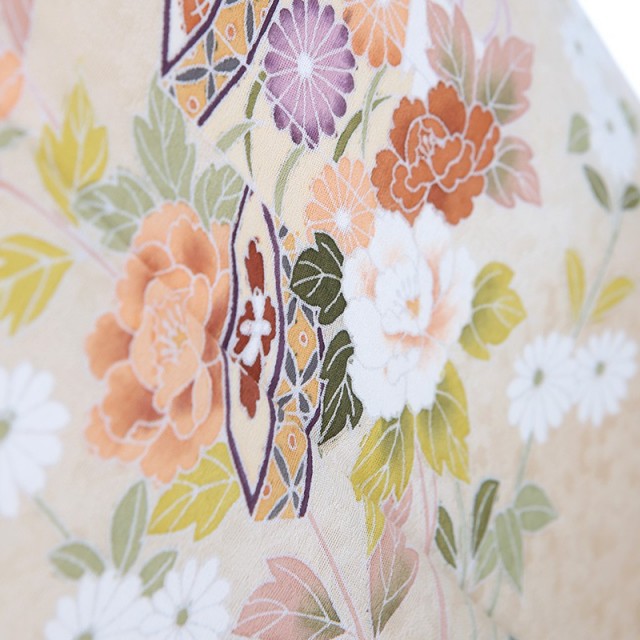 平安時代の情景を描いたような、品格のある一着です。着物地の優しい色味は「鳥の子色(とりのこいろ)」。赤みがかったごく淡い黄色のことです。鎌倉時代から伝わる伝統色で、玉子の殻の色に由来しました。そこに美しい吉祥文様が描かれます。雅な雰囲気の「貝桶」。平安時代などで宮中の遊びで貝合わせというものがあり、その貝を入れておく容器が文様化されたものです。貝とは他の貝とは合わない二枚貝の特徴を持つことから男女の永遠の契りを象徴するものとされており、婚礼のシーンにぴったり。「百花の王」とされる「牡丹」は富貴、高貴、幸福を表しています。「菊」は太陽の形に似ていることから、最も位の高い花とされ、長寿や不老不死の意味も込められます。やはり古くから伝わる文様と、淡い清楚な色味は上品で王道。お祝いの気持ちを着物に託せる、そんな一着になっています。