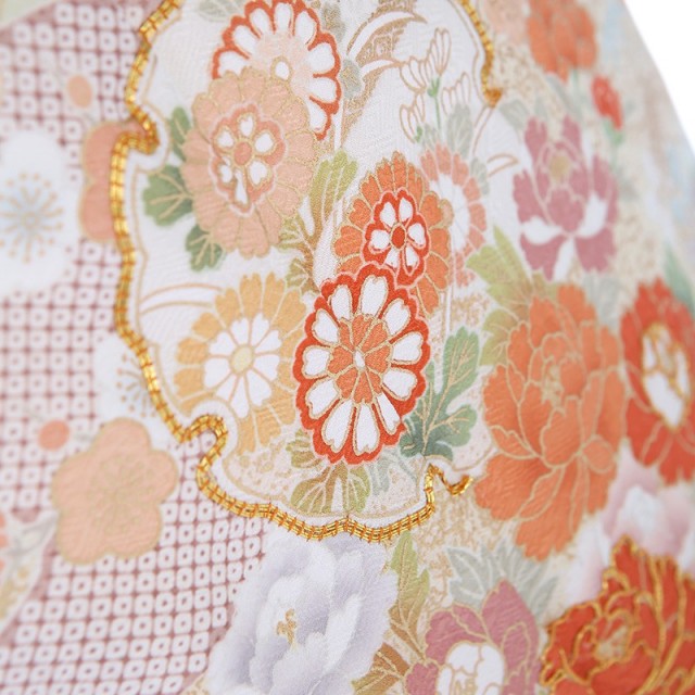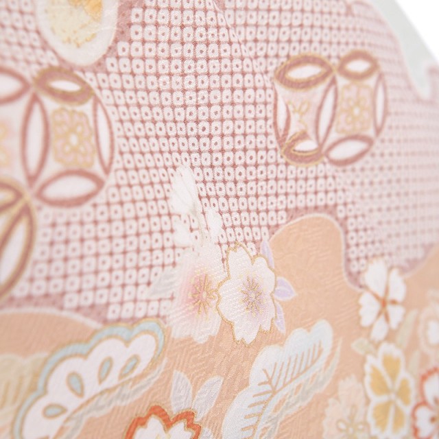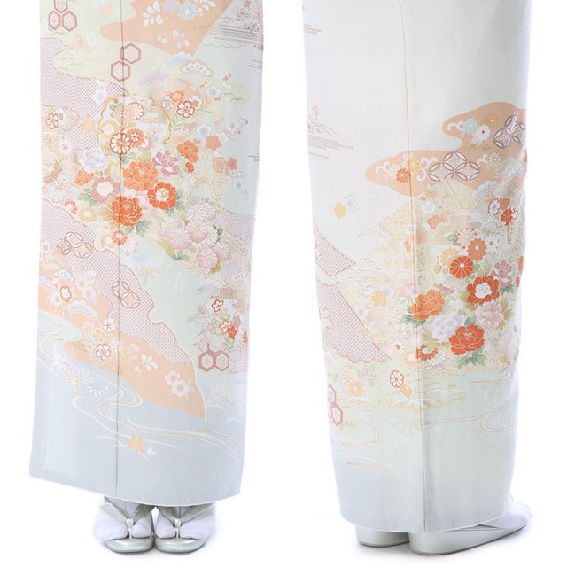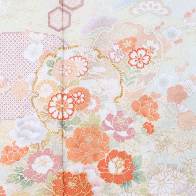 艶やかで高貴さを感じるこちらの訪問着。着物の淡い地色は「白藍(しらあい)」と呼ばれる伝統色。藍染の中で最も薄い色で、黄みを含んだ淡い水色のことです。清楚な印象でおしとやかさを感じます。そして文様は、縁起いい吉祥文様が豪華に描かれます。大輪の花が美しい「牡丹」は、花の美しさと豪華さから「百花の王」とされており、富貴、高貴、幸福を表しています。「桜」は、咲き誇る姿から繁栄や豊かさを表しており、春に咲くことから新しい門出を意味します。「菊」は、太陽のように咲く姿から最も位の高い花とされ高貴さをあらわしています。他にも、冬が終わるといち早く花を咲かせる「梅」、年中美しい緑を絶やさない「松」は、逆境に負けない力強さ、生命力を表します。大人の可愛さと、伝統的な品格を感じる着物は、大切な晴れの日にぴったり。おめでたい文様が詰まった、王道の装いをしていただけます。