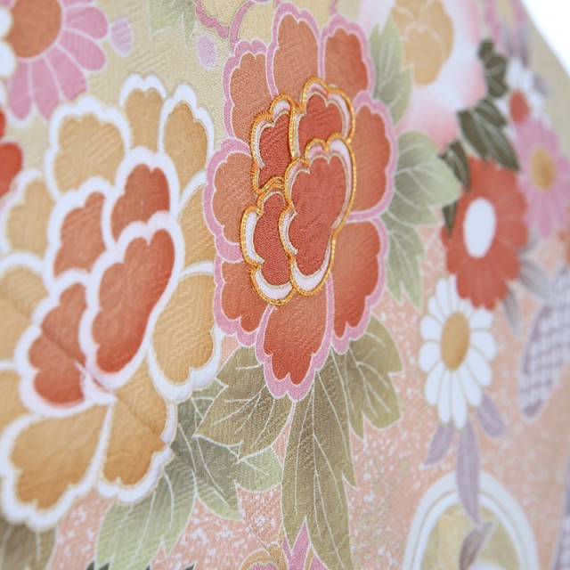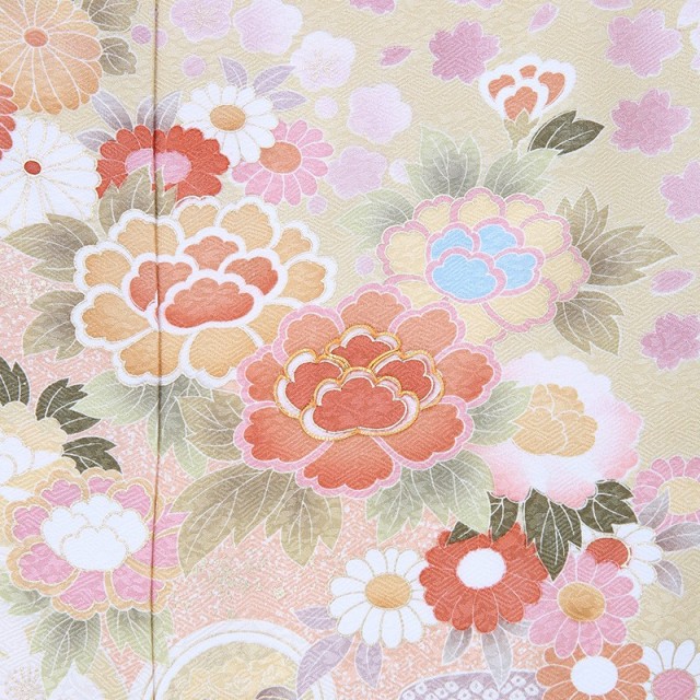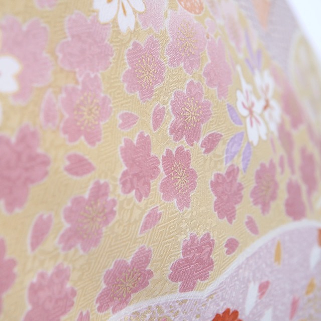 美しい色味に、伝統的な文様が沢山入っており品格を感じさせます。「淡黄(たんこう)」は、その名のとおり淡い色合いの黄色。古くからある伝統色名で、平安時代より親しまれています。純粋な黄色よりもわずかに赤みを含んだ優しいイメージの色です。描かれる文様は古典的で美しい日本の伝統を感じます。「牡丹」は、花の美しさと豪華さから「百花の王」とされており、富貴、高貴、幸福を表しています。「桜」は、咲き誇る姿から繁栄や豊かさを表しており、春に咲くことから新しい門出を意味します。「菊」は、太陽のように咲く姿から最も位の高い花とされ高貴さをあらわしています。そしておめでたいことが起こる前兆に現れる「瑞雲」を、絞り柄で描くことで、更に繊細な印象を与え、奥行きが出て、全体を格上げをしてくれます。おめでたい席をはじめ、大切なシーンで着用していただける華やかで上品な装いです。