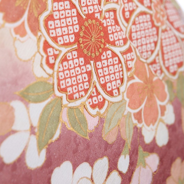 こちらの訪問着は着物地に2色の伝統色が使用されます。くすみのある落ち着いた赤色は「浅緋(あさあけ)」と呼ばれ、茜で薄く染めた緋色のこと。そしてイエローは「淡黄(たんこう)」と呼ばれ、その名のとおり淡い色合いの黄色。古くからある伝統色名で、平安時代より親しまれています。純粋な黄色よりもわずかに赤みを含んだ優しいイメージの色です。文様は、満開の「桜」。冬を越え咲き誇る圧巻の佇まいは、春がはじまる歓びをもたらします。幸先の良い物事のはじまりという前向きな意味が込められています。「貝桶」は、平安時代などで宮中の遊びで貝合わせというものがあり、その貝を入れておく容器が文様化されたものです。貝とは他の貝とは合わない二枚貝の特徴を持つことから男女の永遠の契りを象徴するものとされており、婚礼のシーンにもぴったり。描かれる文様は古典的ですが、色の合わせ方で個性が光るデザインに仕上がっていて、華やかなパーティにもぴったり。お洒落さもありますが、文様にはしっかりとおめでたい意味が込められる、バランスのいい一着です。