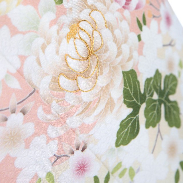 淡い着物の地色が美しく、華やかで豪華な花々の文様がよく映えるエレガントなコーディネートです。薄いグリーンは「白緑(びゃくろく)」と呼ばれ、鉱物の「孔雀石」から作られる岩絵具の色といわれています。そこに描かれる美しい花々にはおめでたい意味が沢山込められています。大輪の花「牡丹」は、姿の美しさと豪華さから「百花の王」とされており、富貴、高貴、幸福を表しています。「菊」は、太陽の形に似ていることから、最も位の高い花とされ、長寿や不老不死の意味も込められます。「撫子」は薄紅色の可憐な花を咲かせます。おしとやかで美しい日本女性を例え「大和撫子」という言葉があるように、文様から上品さを感じます。「松」は、1年中美しい緑を保ち続けることから、逆境に負けない力強さ、生命力を表しています。淡い色合わせで統一感があり、華やかな訪問着をすっきりと見せてくれます。披露宴や、パーティーなどに、祝福の華を添えてくれるおすすめの装いです。