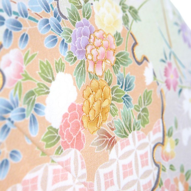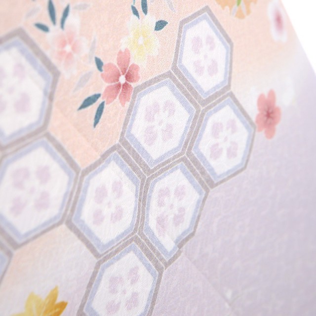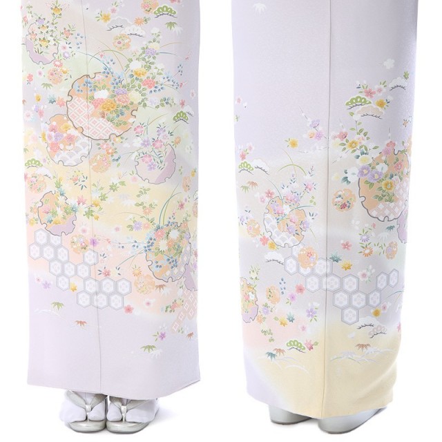 古典的な吉祥文様で時代に左右されない美しい着姿をしていただけます。着物の色は、「淡藤色(あわふじいろ)」と呼ばれる、うすく淡い青紫色。優しく女性らしい藤色をさらに淡くした色で、根強い人気があります。描かれる文様はおめでたい意味がこめられた吉祥文様。「雪輪」という、雪の結晶を花に見立てた文様は、豊作や子孫繁栄を願って使われます。雪輪の中には繊細に描か花々が描かれていて、華やかで格調の高さを感じます。大輪の花「牡丹」は、姿の美しさと豪華さから「百花の王」とされており、富貴、高貴、幸福を表しています。「桜」は、冬を越え咲き誇る圧巻の佇まいは、春がはじまる歓びをもたらします。幸先の良い物事のはじまりという前向きな意味が込められています。他にも「菊」「松竹梅」などが描かれます。また「亀甲花菱」は、亀甲形を上下左右に繋ぎ、中に花びらを入れた文様。おめでたい柄として平安時代から有職文様とされてきました。古来愛されてきた文様や伝統色を使用しているので、いつの時代も変わらない美しさを感じます。人生の大切なシーンに寄り添う品格ある装いです。