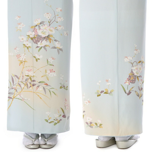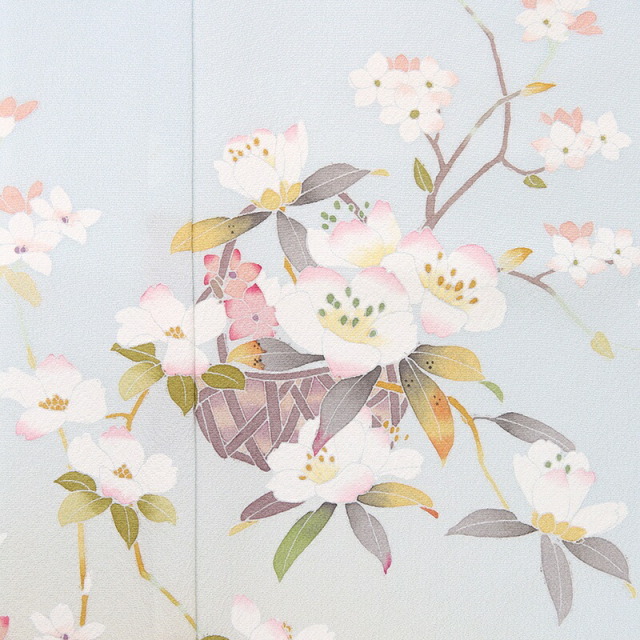 晴れた空のような色使いで、明るく幸せな気持ちにしてくれるこちらの訪問着。着物の地色は淡いブルーで「白藍(しらあい)」と呼ばれ、藍染の中で最も薄い色とされています。描かれる文様は、縁起のいい吉祥文様。「花籠」は、竹で編んだ籠に花を盛った柄。花籠は中国の八仙の1人である「韓湘子(かんしょうし)」の持ち物で、花籠の文様は美しい仙女を象徴し、幸せを呼ぶ文様とされています。そして「牡丹」が中に入っていて非常に華やかな印象。「牡丹」はたくさんの花弁があり「百花の王」と呼ばれており、富貴、高貴、幸福を表しています。優しい地色に、女性らしい美しい文様をほどこした訪問着は、格調の高いシーンにもぴったり。時代に左右されない装いは、大切な日に寄り添ってくれることでしょう。